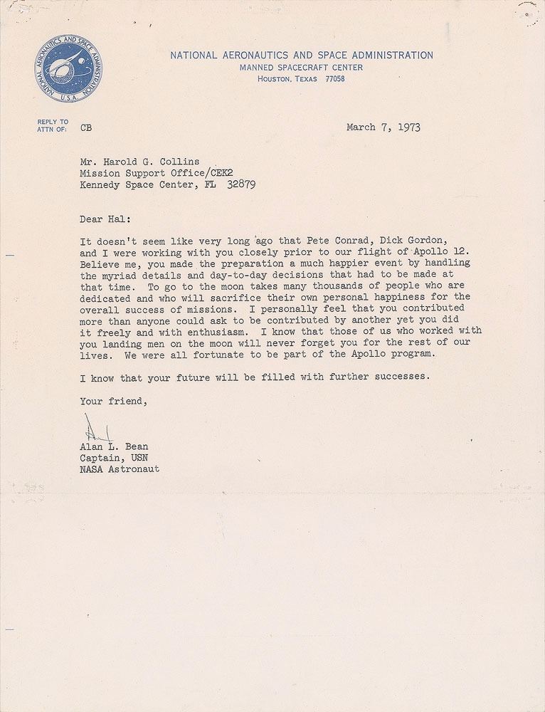 TLS signed “Alan,” one page, 8 x 10.5, NASA letterhead, March 7, 1973. Letter to Harold Collins of the Mission Support Office in the Kennedy Space Center, in full: "It doesn't seem like very long ago that Pete Conrad, Dick Gordon, and I were working with you closely prior to our flight of Apollo 12. Believe me, you made the preparation a much happier event by handling the myriad details and day-to-day decisions that has to be made at that time. To go to the moon takes many thousands of people who are dedicated and who will sacrifice their own personal happiness for the overall success of missions. I personally feel that you contributed more than anyone could ask to be contributed by another yet you did it freely and with enthusiasm. I know that those of us who worked with you landing men on the moon will never forget you for the rest of our lives. We were all fortunate to be part of the Apollo program. I know that your future will be filled with further successes." In fine condition, with several sets of staple holes and two adhesive remnants to reverse of top edge.