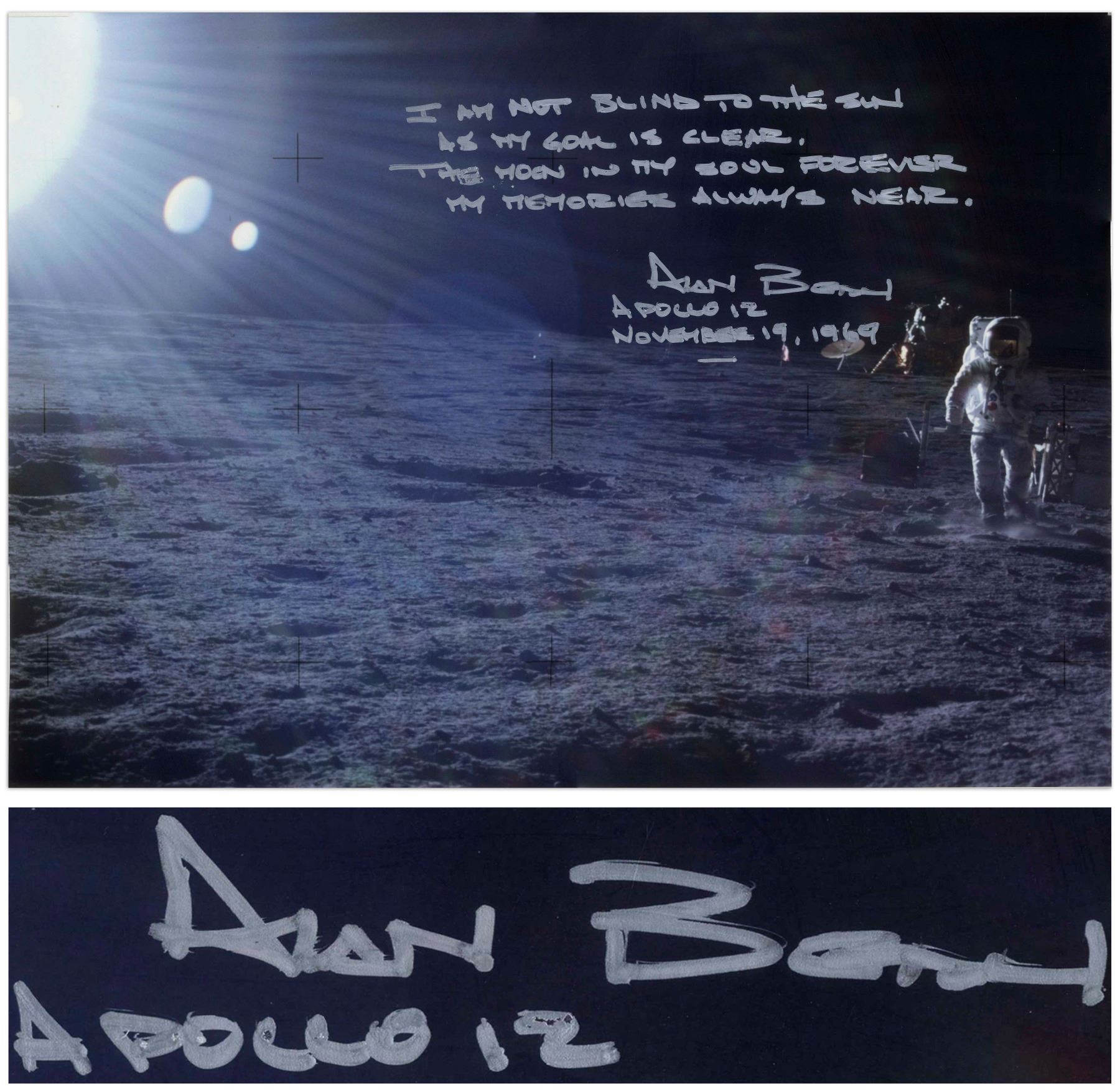 Gorgeous 22.5'' x 16'' photograph of Alan Bean in the Ocean of Storms during the Apollo 12 mission, and with a handwritten poem by Beam, quoting Rudyard Kipling. Bean writes in full, ''I am not blind to the sun / As my goal is clear, / The moon in my soul forever / My memories always near. / Alan Bean / Apollo 12 / November 19, 1969''. Satin-finish photo is near fine.