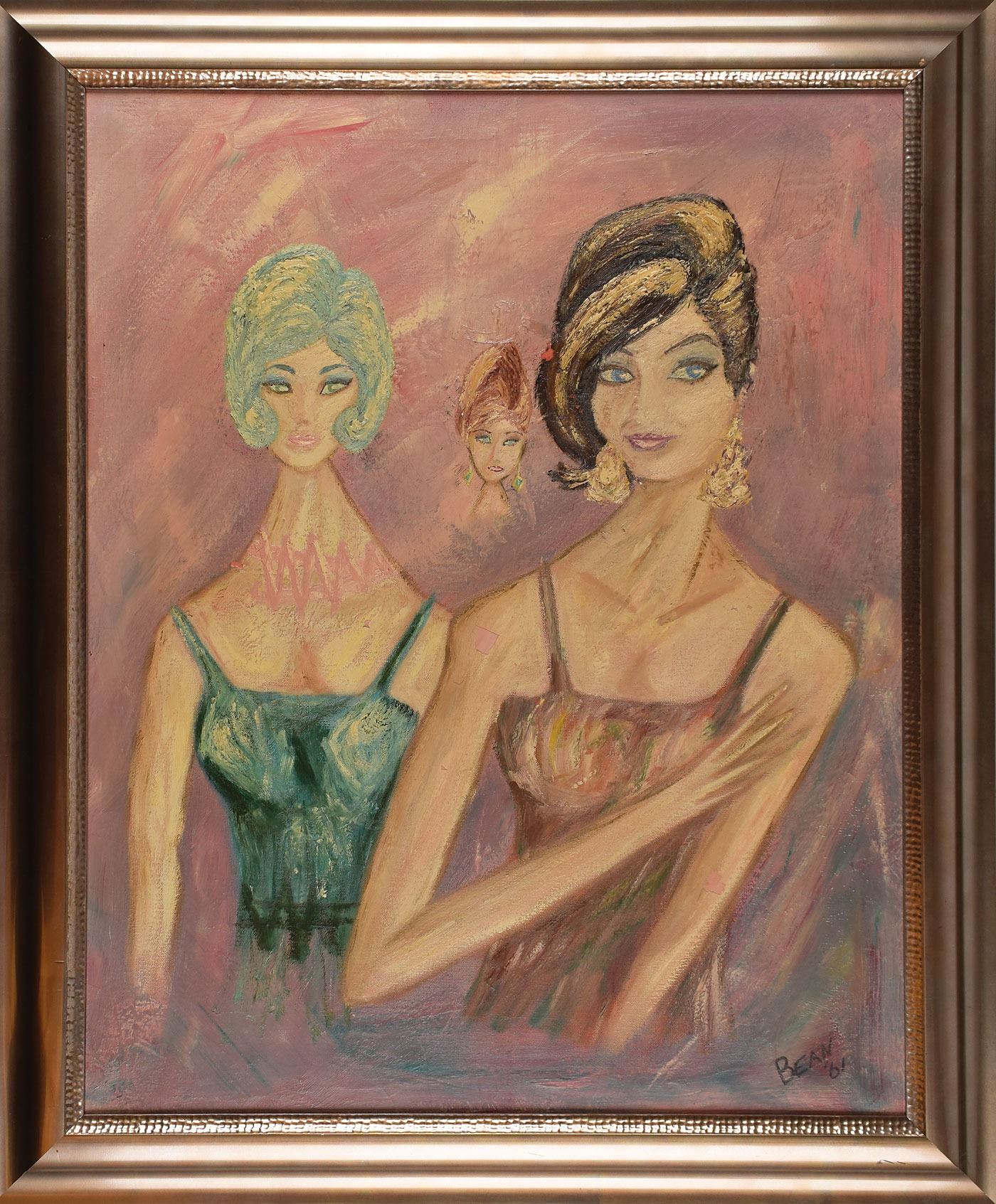 First original painting by future Apollo 12 moonwalker Alan Bean entitled ‘Three Women,’ 21.5 x 27.5, accomplished in oil on canvas, depicting a group of three elegantly dressed women, two in half-length pose and the face of a third portrayed in the background, signed in the lower right corner in black paint by the artist, “Bean, ’61.” Framed without glass to an overall size of 26.5 x 32.5. In fine condition, with a few areas of chipping to paint, most notably to the lead woman's shoulder and forearm. According to Alan Bean's gallery website, 'Three Women' is placed as the earliest non-lunar painting by Bean, accomplished some two years before he was selected by NASA as part of Astronaut Group 3. An incredible opportunity to own the earliest known painting by an astronaut widely considered the most talented artist of the Apollo fraternity.
