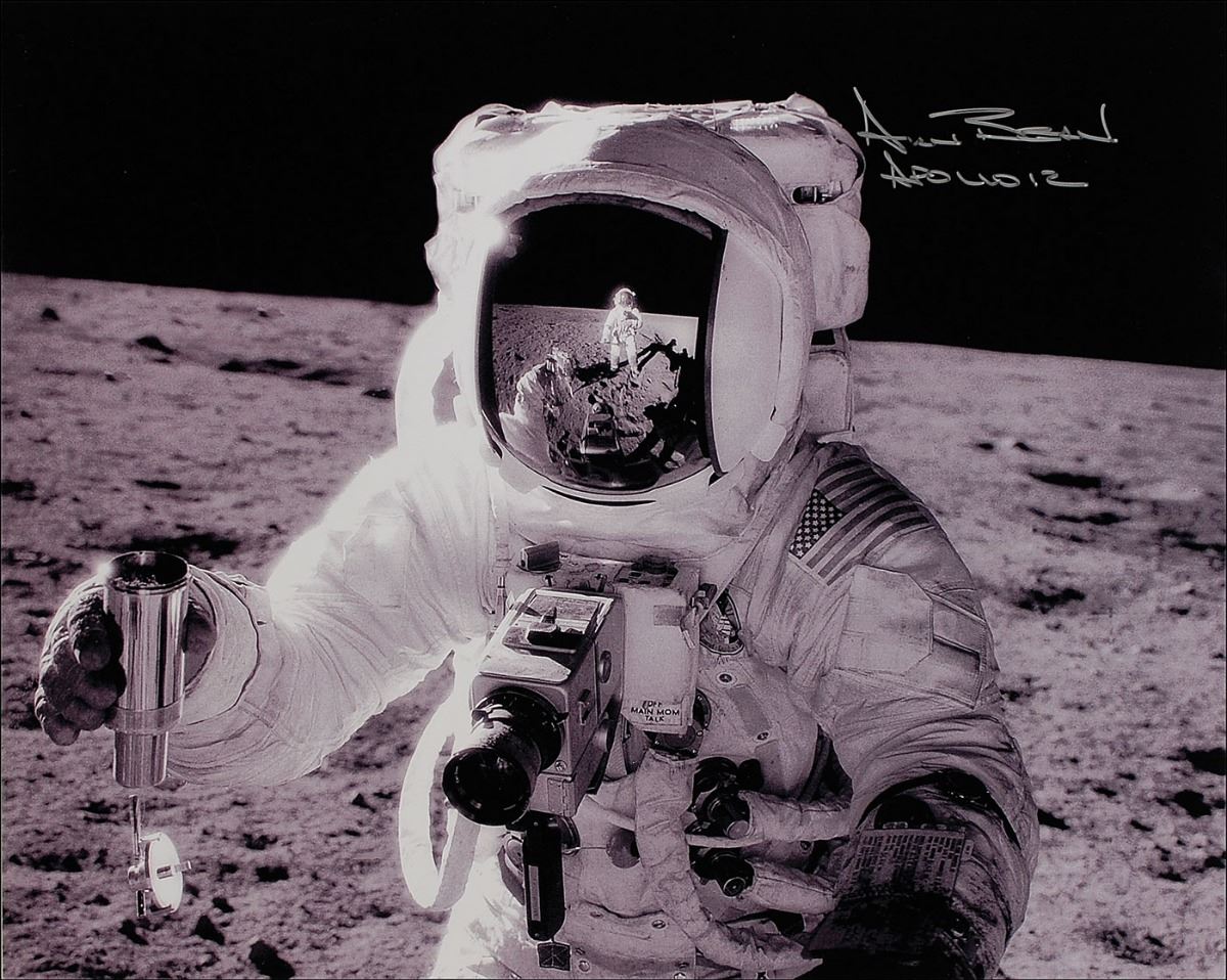 Wonderful satin-finish 20 x 16 close-up photo of Bean conducting an experiment on the moon, signed in silver ink, “Alan Bean, Apollo 12.” In fine condition, with some scattered bends and small creases.