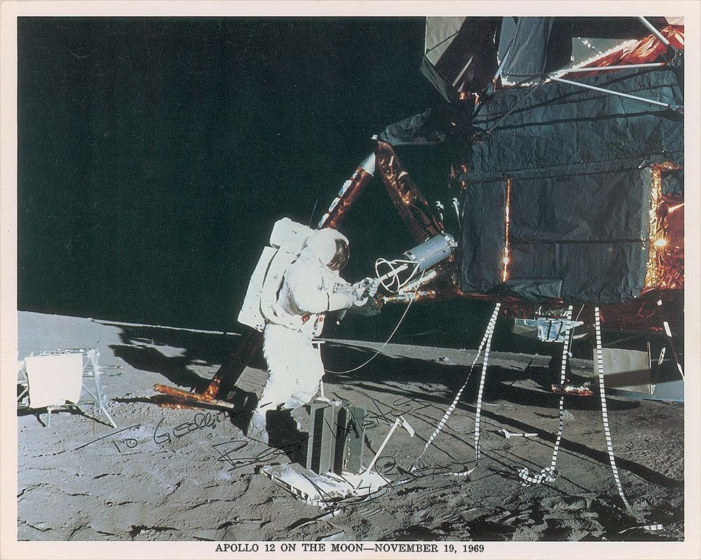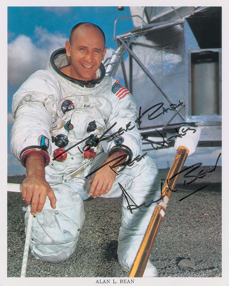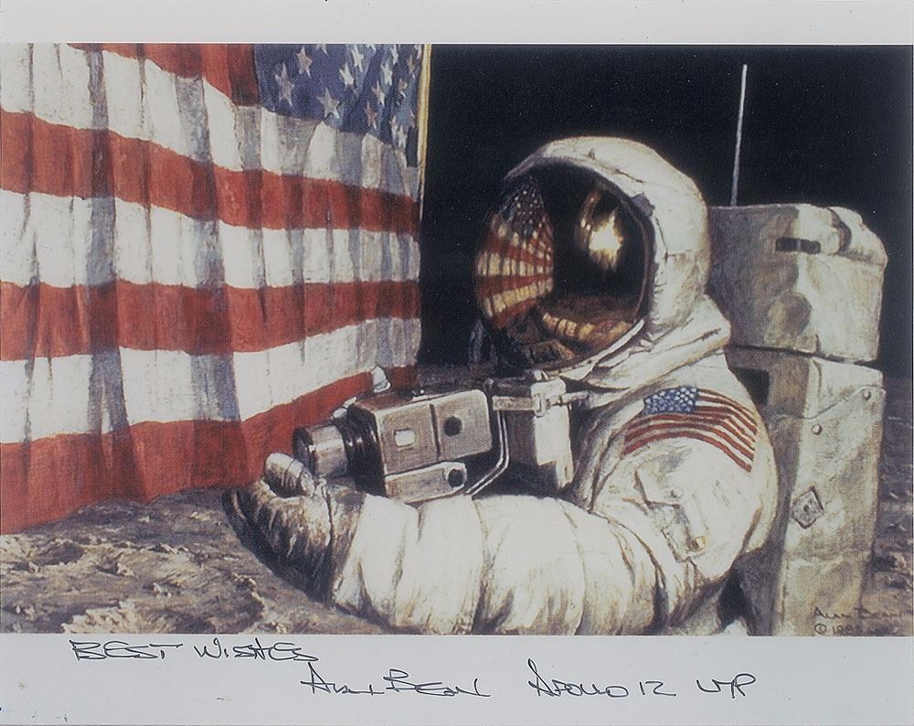 Three photos signed by moonwalker Alan Bean: a color glossy 10 x 8 photo of Bean's 'Straightening Our Stripes' painting, signed in the lower border in thin black felt tip, "Best wishes, Alan Bean Apollo 12 LMP"; an official color 8 x 10 NASA lithograph of Bean kneeling in front of the lunar lander, signed and inscribed in black felt tip, "To Steve & Ralph, Best Wishes, Alan L. Bean"; and an official color 10 x 8 NASA lithograph of Bean working on the fuel cask mounted to the lunar module, signed and inscribed in black felt tip, "To Georgia—Best Wishes, Alan Bean." In overall fine condition. Accompanied by a photo taken at the time of the 'Straightening Our Stripes' signing.