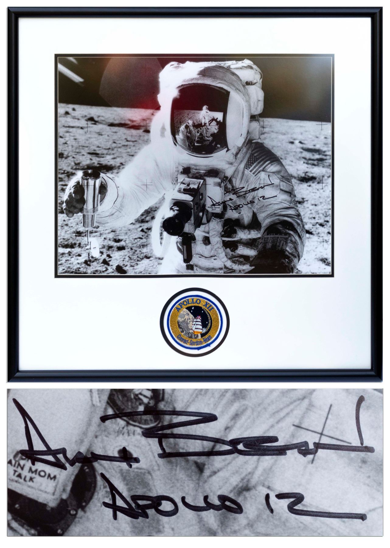 Dramatic signed photo of Alan Bean standing on the moon, holding a container of lunar soil during the Apollo 12 mission. Bean signs in bold black felt-tip across his spacesuit, ''Alan Bean / Apollo 12''. Large photo measures 20'' x 16'', framed with a mission patch to a size of 26.75'' square. Near fine condition. With Novaspace COA.