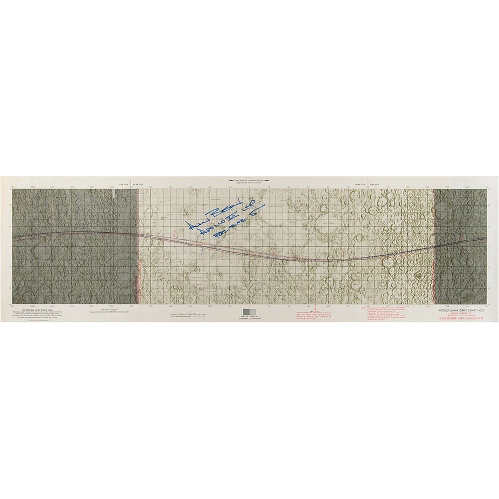 Color first edition of the Apollo 12 Lunar Orbit Chart, scale 1:11,000,000 at the equator, 41 x 12, dated October 8, 1969, signed in blue felt tip next to the Ocean of Storms landing site, "Alan Bean, Apollo XII LMP, For Site 5.‰Û The chart displays areas in darkness and earthshine, lunar sunset and sunrise terminator lines for lunar revolutions, and a wide assortment of lunar landmarks and regions. Titled in the lower right corner, "Apollo Lunar Orbit Chart (ALO), Apollo Mission 12, Revolutions 1, 18, 19, 38, 39, and 45, 16 November 1969 Launch Date." Lithographed by ACIC 10-69, and prepared under the direction of the Department of Defense by the Aeronautical Chart and Information Center. Rolled and in fine condition, with some light unobtrusive creasing.