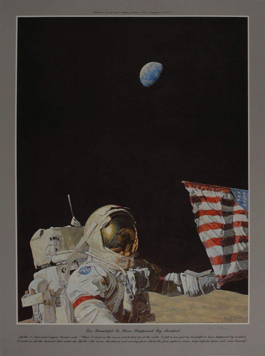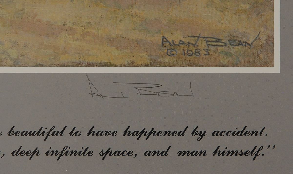 Exceptional color limited edition 26 x 35 print of an Alan Bean painting entitled ‘Too Beautiful to Have Happened by Accident,’ numbered 590/600, signed in the lower border in pencil by Bean. Published in 1984 by Long & Company. In fine condition. An ideal example of Bean’s first released print.