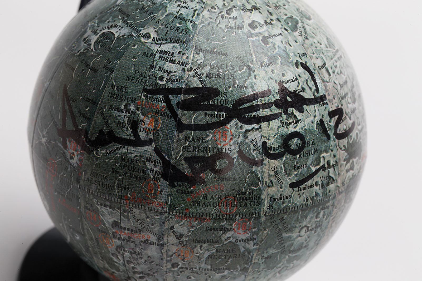 Apollo Moon Flights Globe manufactured in 1970 by Bonus Enterprises, measuring 4.25? in diameter, signed to the upper right of the scheduled Apollo 12 landing site in thick black felt tip, "Alan Bean, Apollo 12." In fine condition. An appealing format signed by the fourth moonwalker.