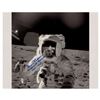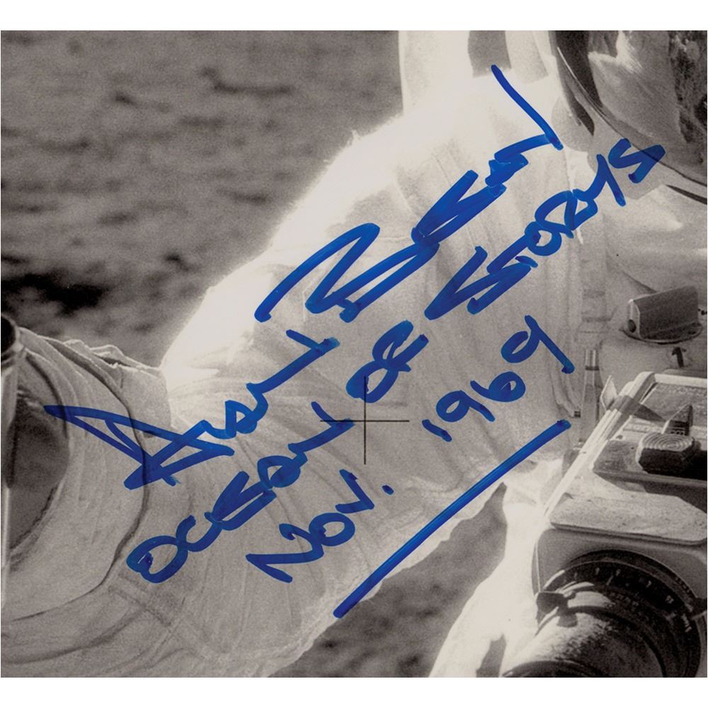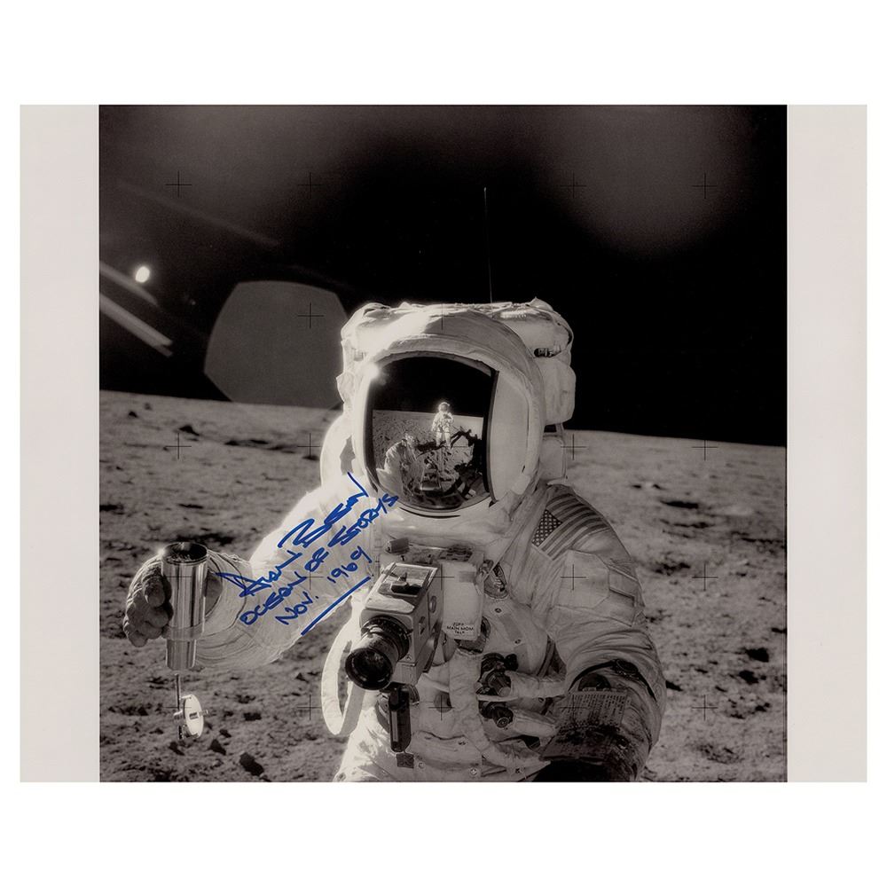 Glossy 20 x 16 close-up photo of LMP Alan Bean holding an Environmental Sample Container during the Apollo 12 mission, with the photographer, CDR Charles Conrad, visible in his visor, signed in blue felt tip, "Alan Bean, Ocean of Storms, Nov. 1969." In fine condition.