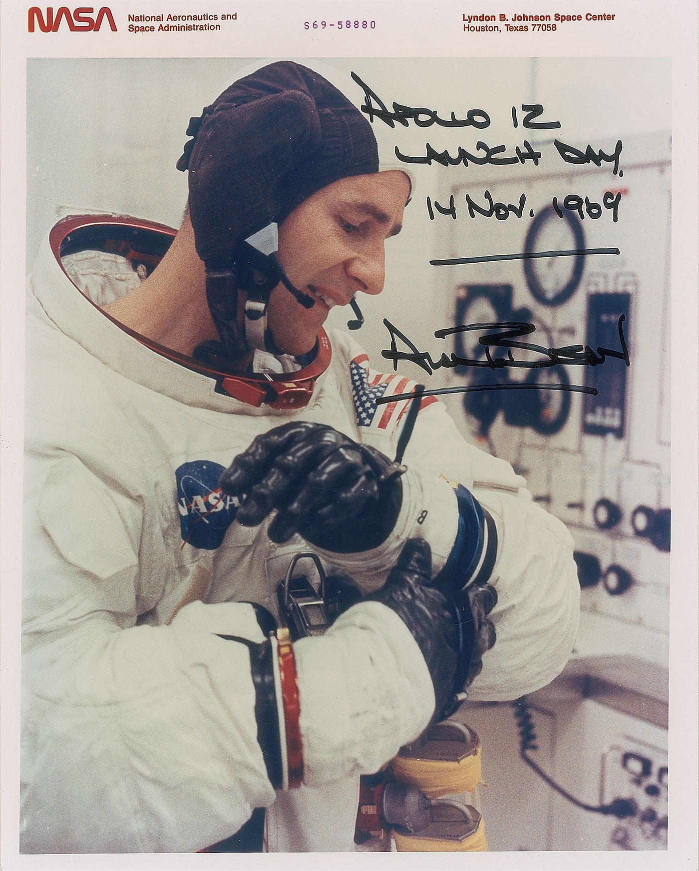 Official color semi-glossy 8 x 9.75 red-numbered NASA photo of Bean suiting up prior to the Apollo 12 mission, signed in black felt tip, "Apollo 12 launch day, 14 Nov. 1969, Alan Bean." In fine condition.