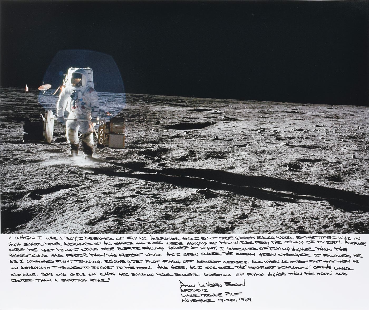 Brilliant color semi-glossy 24 x 20 photo of Bean carrying two sub packages of the Apollo Lunar Surface Experiments Package (ALSEP) during the first Apollo 12 EVA, signed in the lower border in black felt tip, "Alan LaVern Bean, Apollo 12, Lunar Module Pilot, November 19-20, 1969," who adds a lengthy inscription above: "'When I was a boy, I dreamed of flying airplanes, and I built models from Balsa wood. By the time I was in high school, model airplanes of all shapes and sizes were hanging by thin wires from the ceiling of my room. Airplanes were the last thing I would see before falling asleep at night. I dreamed of flying higher than the highest cloud and faster than the fastest wind. As I grew older, the dream grew stronger. It followed me as I completed flight training, became a jet pilot flying off aircraft carriers, and when as a test pilot and then as as an astronaut, I trained to rocket to the moon. And here, as I look over the 'magnificent desolation' of the lunar surface, boys and girls on Earth are building model rockets, dreaming of flying higher than the moon and faster than a shooting star.'" In fine condition.