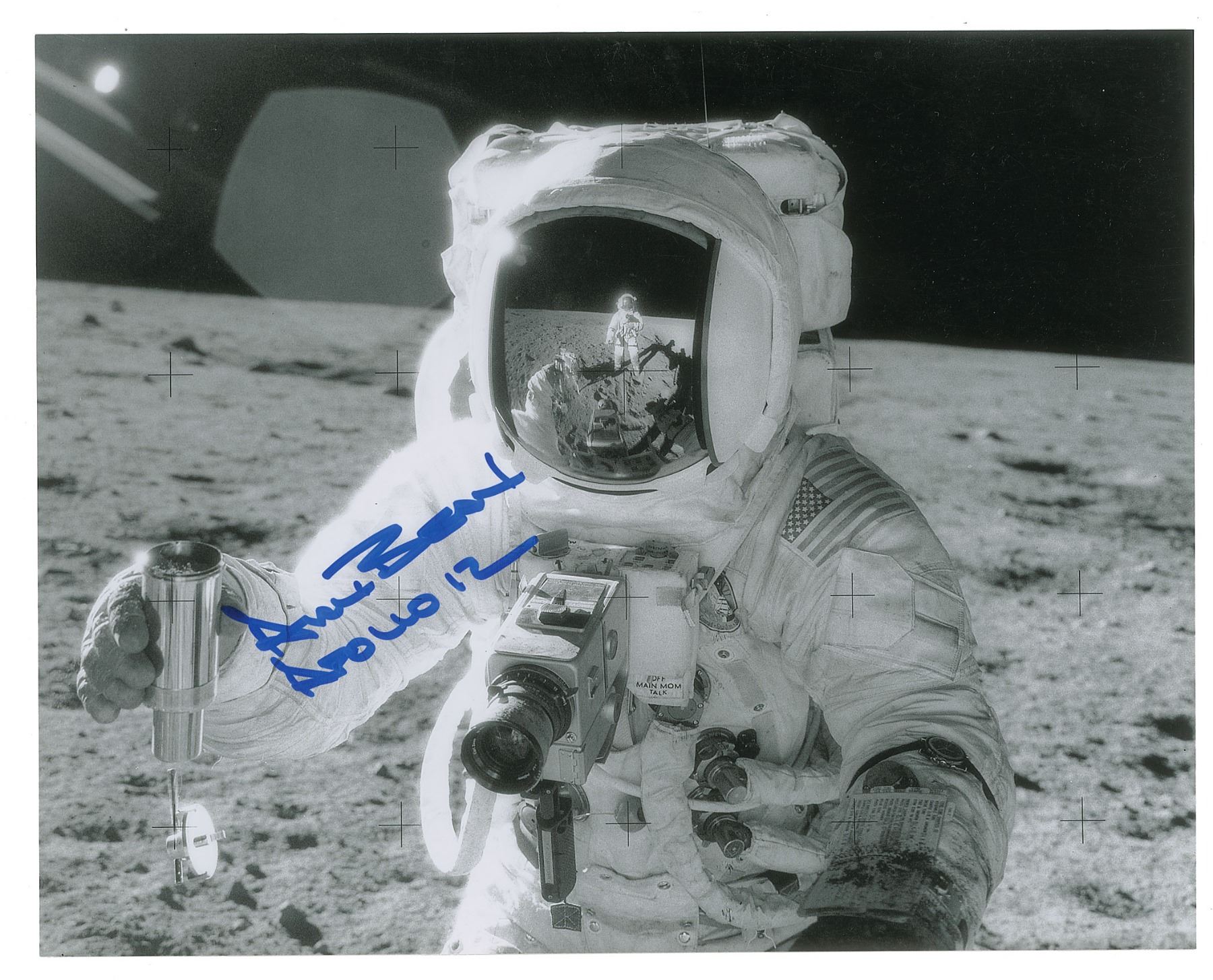 Satin-finish 10 x 8 photo of Bean holding a lunar soil sample, signed in blue felt tip, "Alan Bean, Apollo 12." In fine condition, with a few small surface creases.