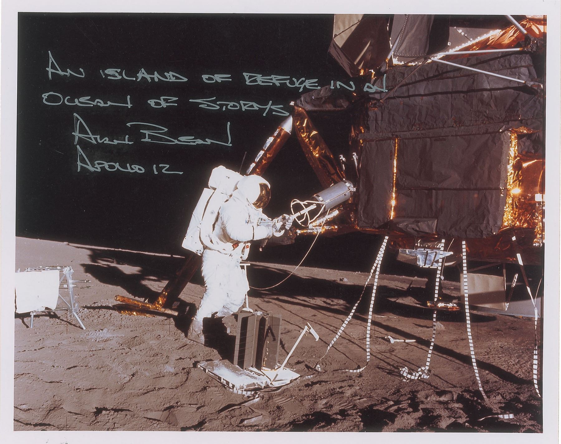 Color satin-finish 10 x 8 photo of Bean working at the base of the Lunar Module, signed in silver ink, "An Island of Refuge in an Ocean of Storms, Alan Bean, Apollo 12." In fine condition.