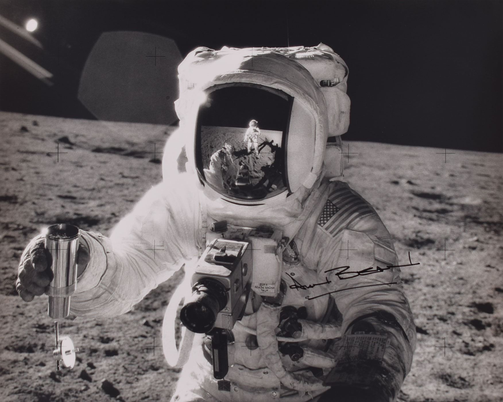 Satin-finish 20 x 16 photo of Lunar Module Pilot Alan Bean holding a lunar soil sample during an Apollo 12 EVA, with the photographer, Charles Conrad, reflected in Bean's visor, signed in black felt tip by Bean. In fine condition.