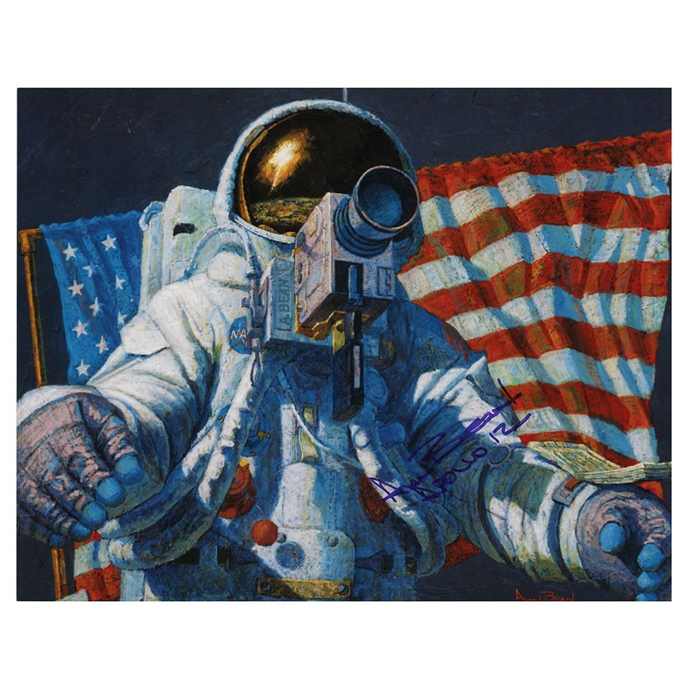 Uncommon color 14 x 11 promotional card from the Greenwich Workshop depicting Alan Bean's painting 'Clan MacBean Arrives on the Moon,' signed on the front in purple felt tip, "Alan Bean, Apollo 12." Reverse features information text relative to the artwork and artist. In fine condition.