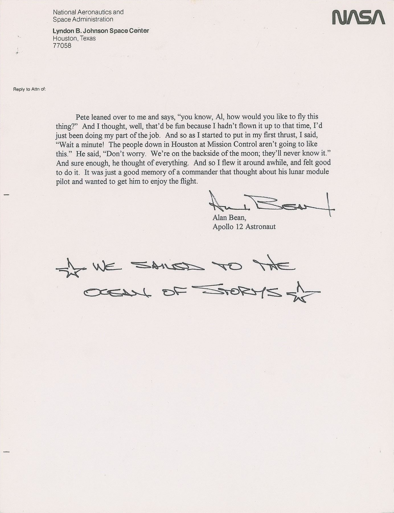 Typed statement, one page, 8.5 x 11, NASA letterhead, no date. In full, “Pete leaned over to me and says, ‘you know, Al, how would you like to fly this thing?’ And I thought, well, that’d be fun because I hadn’t flown it up to that time, I’d just been doing my part of the job. And so as I started to put in my first thrust, I said, ‘Wait a minute! The people down in Houston at Mission Control aren’t going to like this.’ He said, ‘Don’t worry. We’re on the backside of the moon; they’ll never know it.’ And sure enough, he thought of everything. And so I flew it around awhile, and felt good to do it. It was just a good memory of a commander that thought about his lunar module pilot and wanted to get him to enjoy the flight.” Signed at the conclusion in black felt tip by Bean, who adds: "We sailed to the Ocean of Storms." In fine condition.