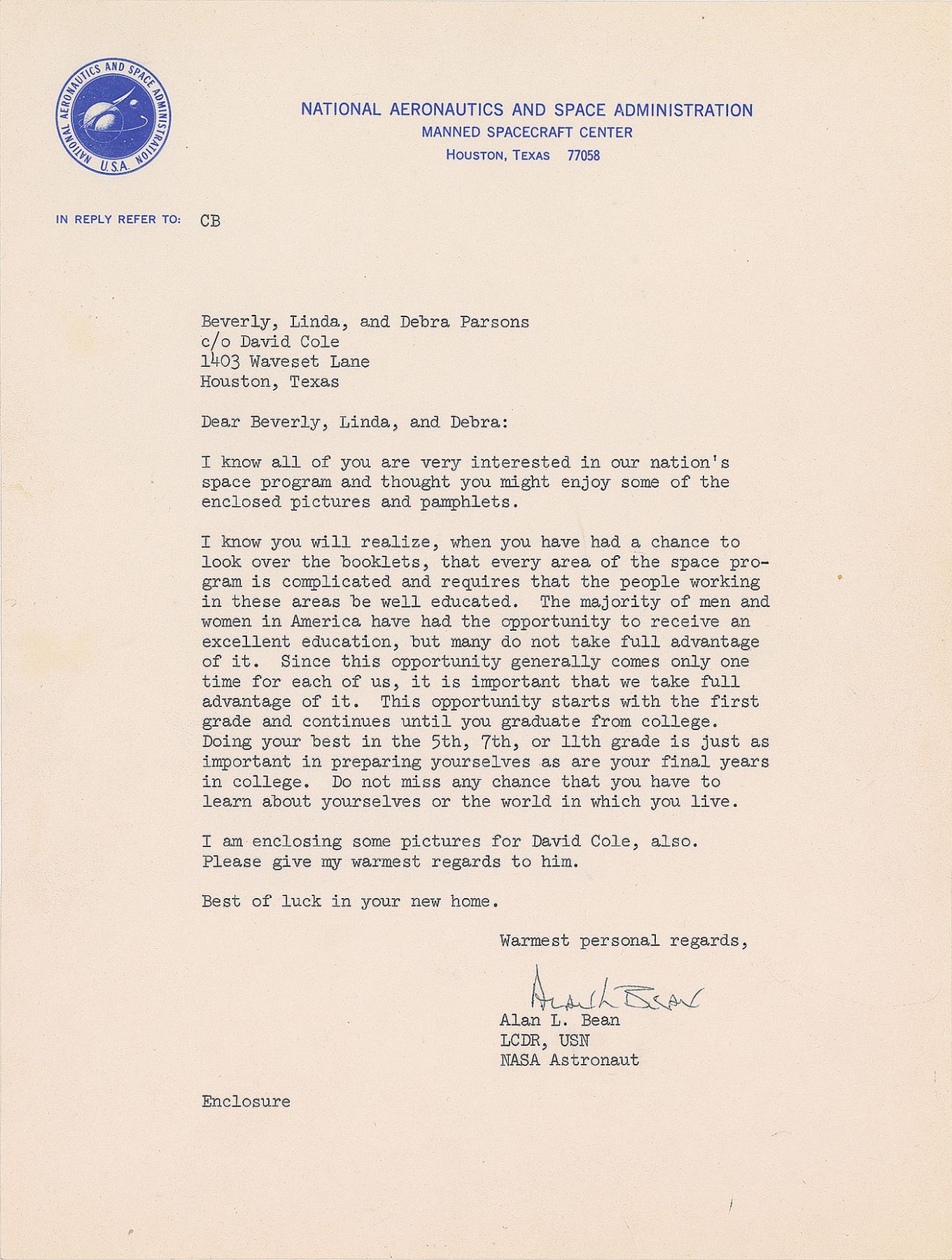 TLS signed “Alan L. Bean,” one page, 8 x 10.5, NASA letterhead, no date but 1968–1970. Letter to Beverly, Linda, and Debra Parsons, in part: "I know all of you are very interested in our nation's space program and thought you might enjoy some of the enclosed pictures and pamphlets. I know you will realize, when you have had a chance to look over the booklets, that every area of the space program is complicated and requires that the people working in these areas be well educated. The majority of men and women in America have had the opportunity to receive an excellent education, but many do not take full advantage of it. Since this opportunity generally comes only one time for each of us, it is important that we take full advantage of it. This opportunity starts with the first grade and continues until you graduate from college. Doing your best in the 5th, 7th, or 11th grade is just as important in preparing yourselves as are your final years in college. Do not miss any chance that you have to learn about yourselves or the world in which you live." In fine condition. Accompanied by a letter of provenance from the brother of the original recipient, in part: "While Gail and her husband and family were living in Clear Lake City, Texas, she attended the same church as astronaut Alan L. Bean. Gail, never being shy, had a conversation with him after church service one Sunday, asking him to send a letter to her daughters urging them to do well in school."