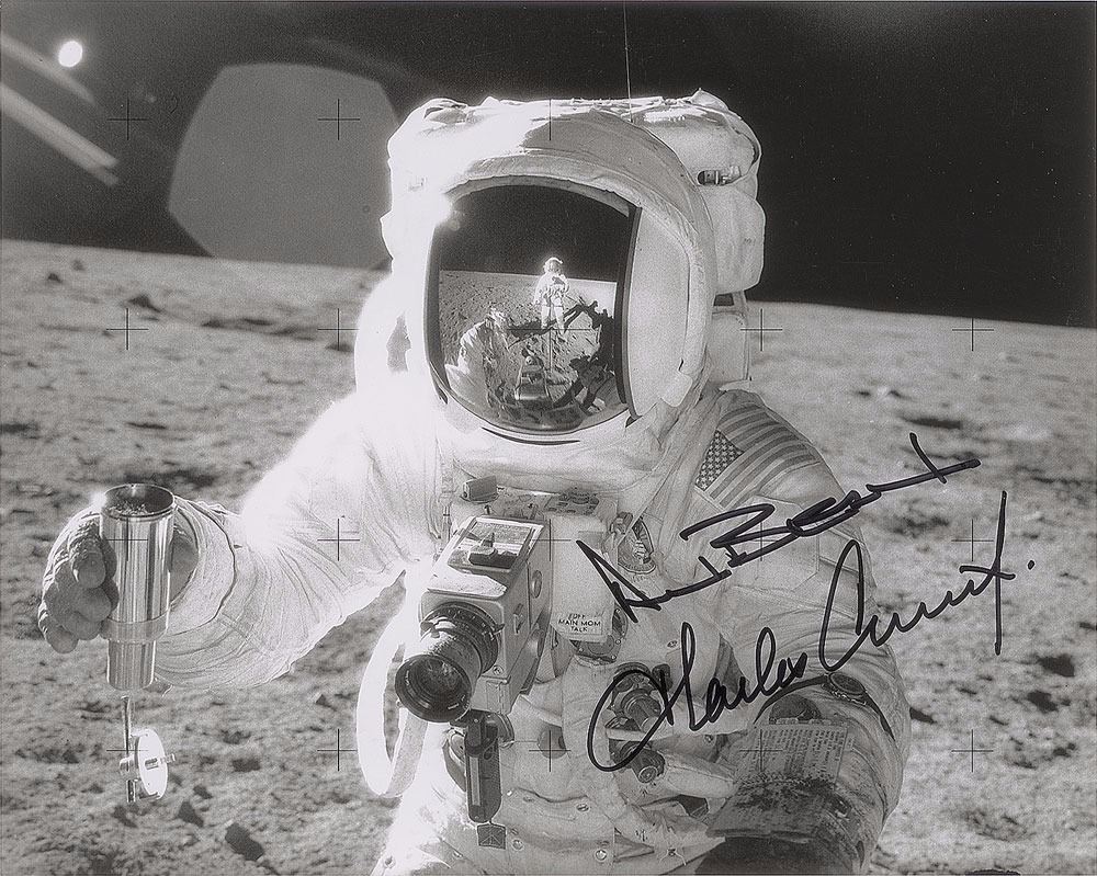 Glossy 10 x 8 black and white photo of an Apollo 12 astronaut collecting soil samples, his visor showing the reflection of his fellow moonwalker, signed in black felt tip, "Alan Bean" and "Charles Conrad, Jr." In fine condition.