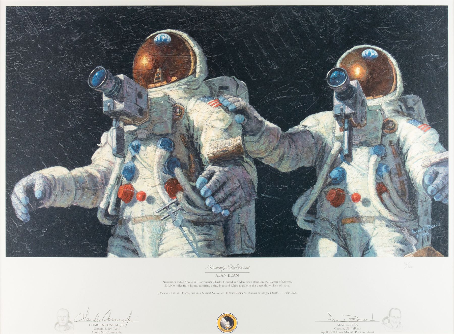 Color limited edition 24.5 x 18 lithograph entitled 'Heavenly Reflections,' numbered 70/850, signed in the lower border in pencil by Apollo 12 moonwalkers Alan Bean and Charles Conrad. Bean's artwork shows the pair looking homeward while standing in the 'Ocean of Storms.' Double-matted and framed to an overall size of 32 x 26. In fine condition. Accompanied by a certificate of authenticity from the publisher, The Greenwich Workshop.