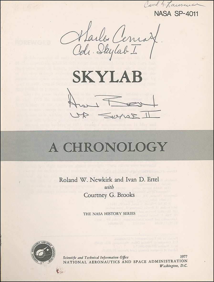 Signed book: Skylab: A Chronology. Washington, DC: NASA, 1977. Softcover, 8 x 10.25, 458 pages. Signed on the title page in black ballpoint, “Charles Conrad, Jr., Cdr. Skylab I” and “Alan Bean, LMP Skylab II.” An ownership notation to the upper right corner of the title page, light soiling to the front cover and title page, and a few dings to the spine, otherwise fine condition.