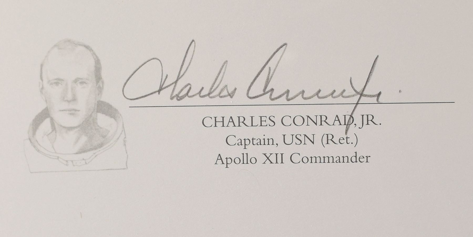 Limited edition color 27 x 21.25 print of an Alan Bean painting entitled 'Heavenly Reflections,' depicting Bean and Charles Conrad looking at the earth from the lunar surface, numbered 317/850, signed in the lower border in pencil by Charles Conrad and Alan Bean. Sealed and in fine condition. Accompanied by the original Greenwich Workshop protective sleeve.