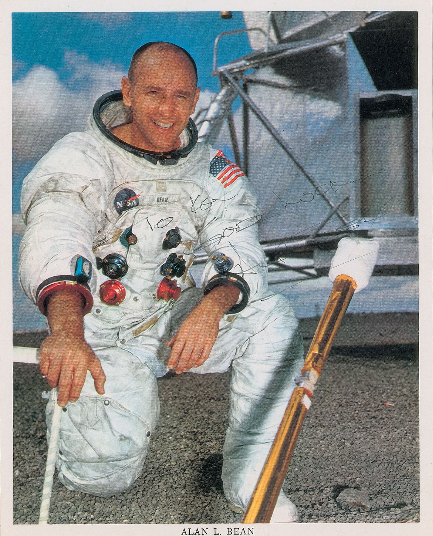 Official color 8 x 10 NASA lithograph of Bean in his white space suit, kneeling before a Lunar Module, signed and inscribed in black felt tip, "To Ken, Good Luck, Alan Bean.” In fine condition, with poor-to-moderate signature contrast.