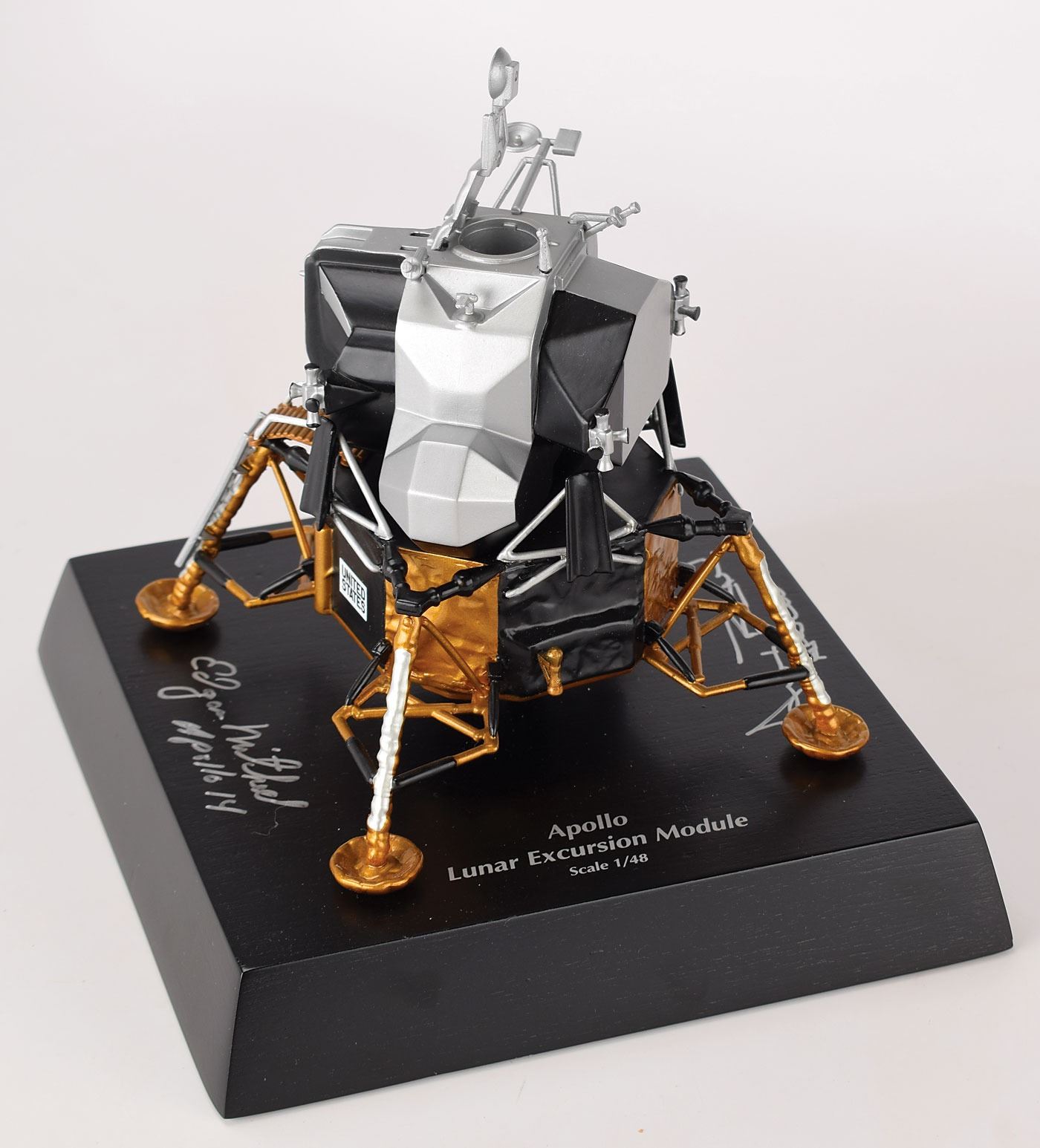 Desirable 1:48 scale model of the Apollo Lunar Excursion Module (LEM), beautifully signed on the black base in silver ink by two moonwalkers, "Alan Bean, Apollo 12" and "Edgar Mitchell, Apollo 14." The complete model and base assembly measures approximately 8? x 7? x 8?. In very good to fine condition, with the hinge of one antenna broken, and another smaller antenna bent.