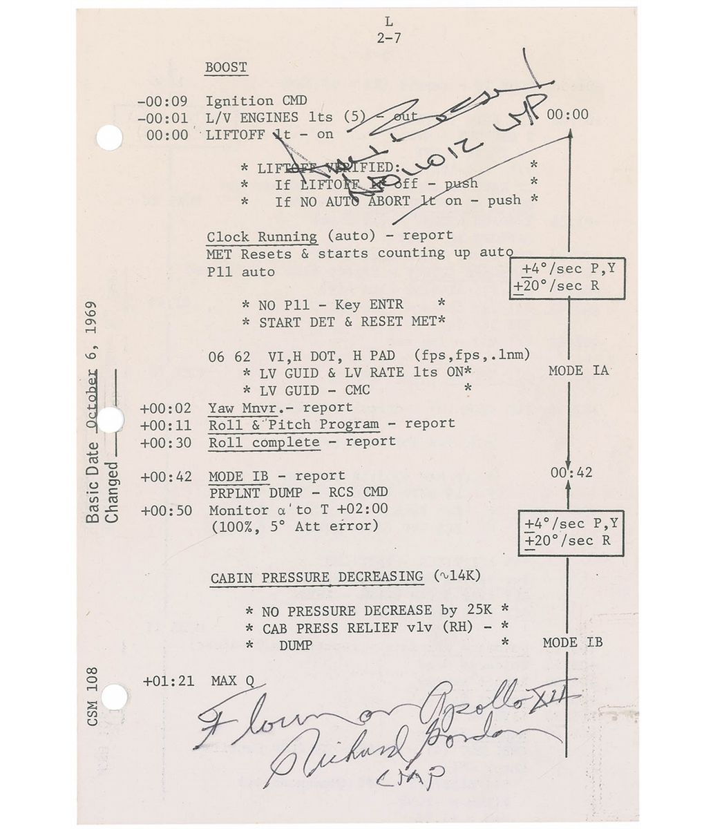 Flown checklist page from the Apollo 12 Launch Operations Checklist, 5.25 x 8, designated pages L2-7 and L2-8, carried on board the Command Module Yankee Clipper. The page details mission launch activity from nine seconds prior to lift-off through the first six minutes of the mission, during which time the capsule was hit by lightening at launch. Signed in black ink “Flown on Apollo XII, Richard Gordon, Apollo XII CMP,” and “Alan Bean, Apollo 12 LMP.” In fine condition. Accompanied by a 2009 certificate of authenticity from Gordon stating “this checklist page…has been in my sole possession and part of my personal space collection since my return from the moon.”