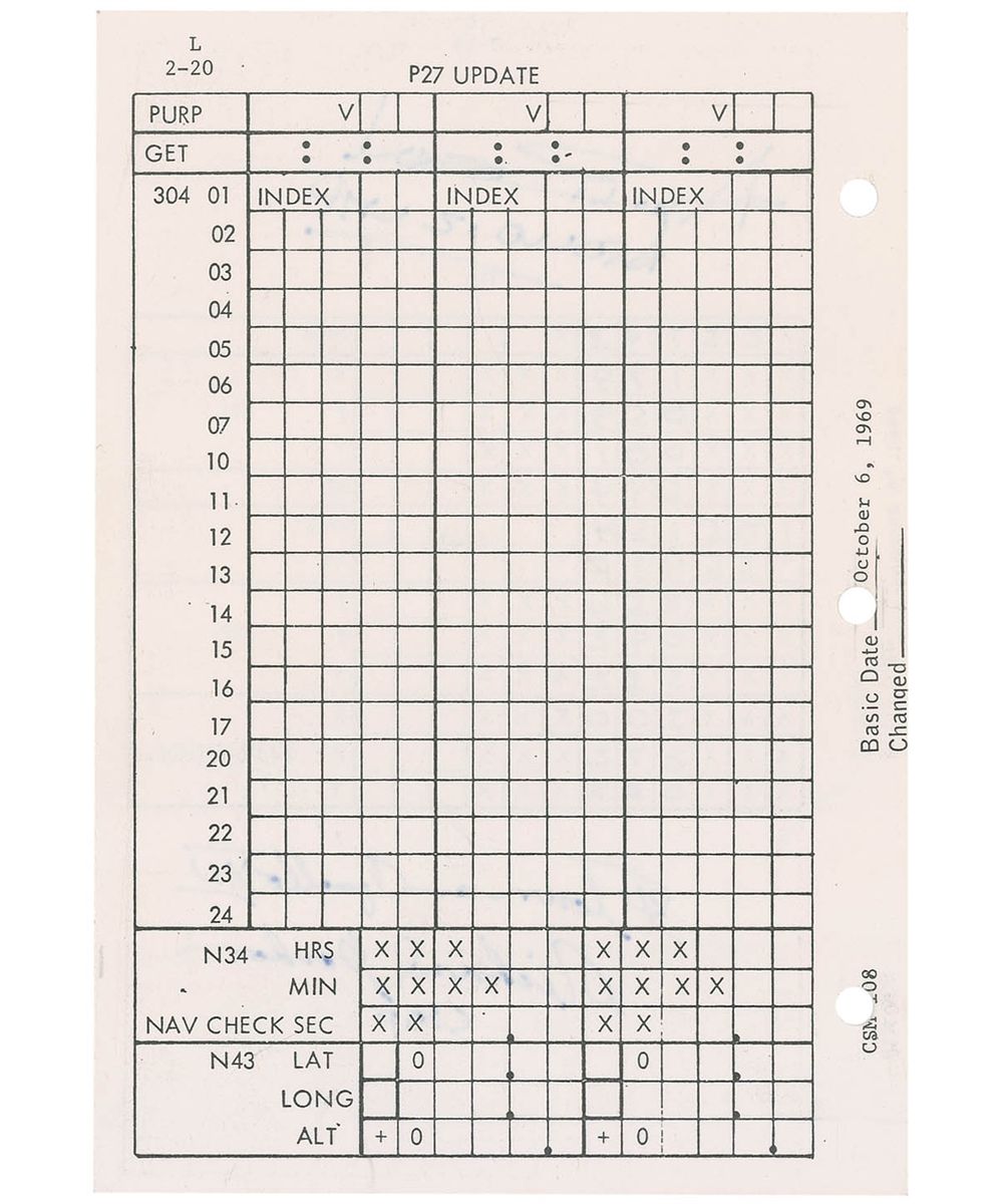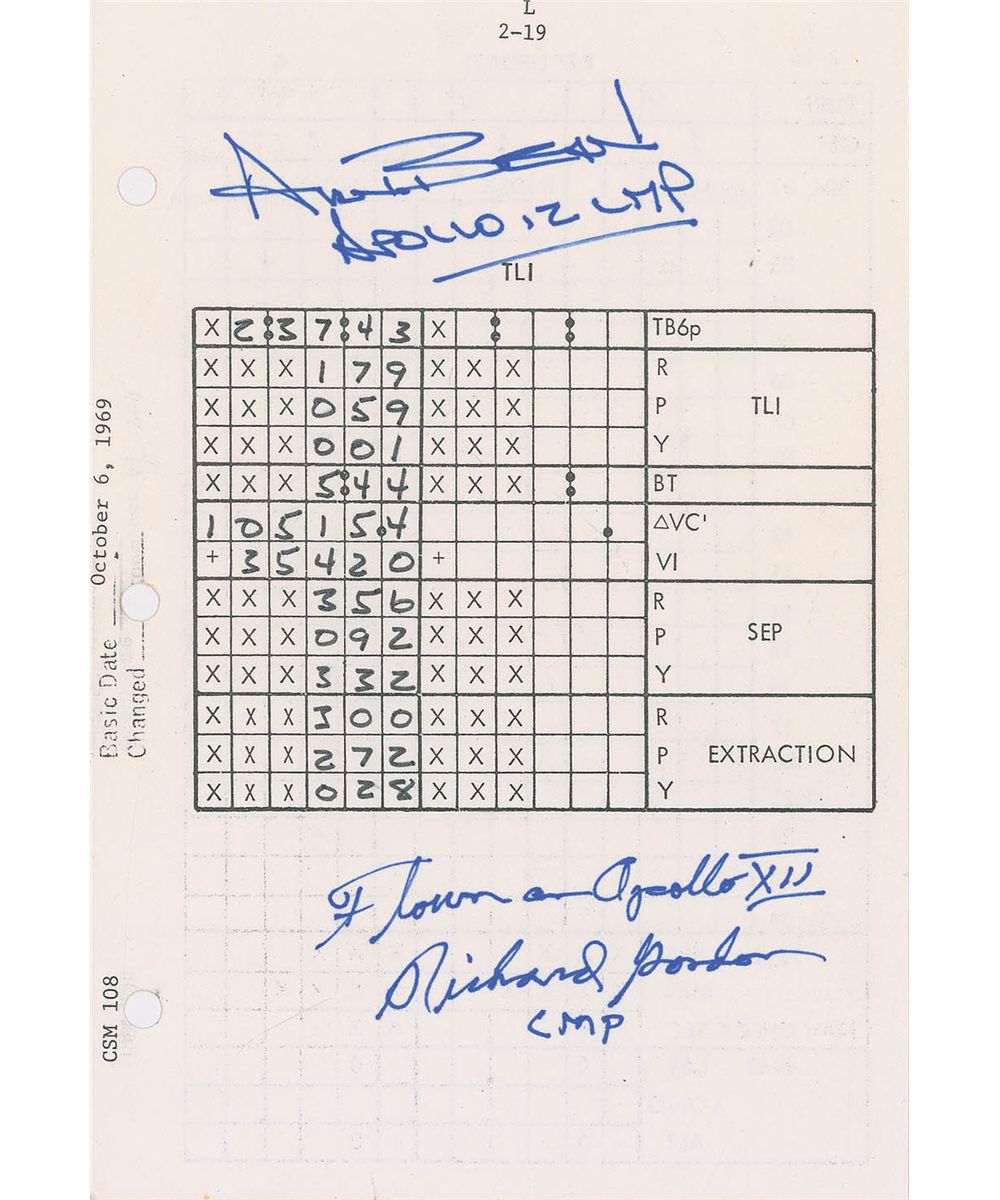 Flown two-sided Trans Lunar Injection (TLI) checklist page, carried on board Apollo 12, 5.5 x 8, identified as pages 2-19 and 2-20 and dated October 6, 1969, signed in blue felt tip, “Flown on Apollo XII, Richard Gordon, CMP” and “Alan Bean, Apollo 12 LMP.” The notations on the page were critical for the TLI firing of the Saturn IVB to propel Apollo 12 to the moon. These notations were made at 1 hour 47 minutes into the mission. From mission transcript 001:47:56 Conrad: Okay. You want me to read it to you? It's 2:37:43, 179, 059, 001; burn time is 5 plus 44, 1051.54, 35420, 356, 092, 332, 300, 272, 028. TLI occurred 2 hours 37 minutes into the mission. In fine condition, with three punch holes to left border. Accompanied by a CD with photos of both astronauts taken at time of signing.