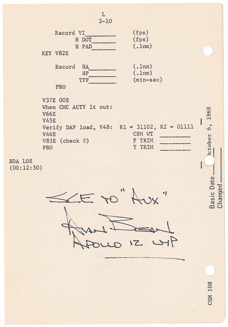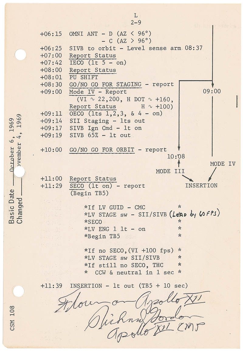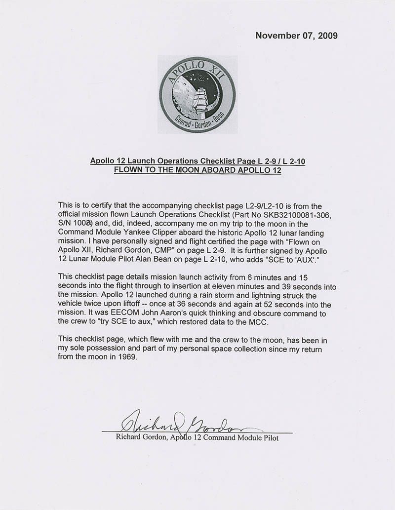 Flown checklist page from the Apollo 12 Launch Operations Checklist, 5.25 x 8, designated pages L2-9 and L2-10, carried on board the Command Module Yankee Clipper. The page details mission launch activity from 6:15 into the flight up to insertion at 11:39. Signed on one side “Flown on Apollo XII, Richard Gordon, Apollo XII CMP,” and signed on the reverse “SCE to ‘AUX’ Alan Bean, Apollo 12 LMP.” Bean is referencing a data restoration command after the vehicle was struck twice by lightning during liftoff. In fine condition. Accompanied by a 2009 certificate of authenticity from Gordon stating “this checklist page…has been in my sole possession and part of my personal space collection since my return from the moon.”