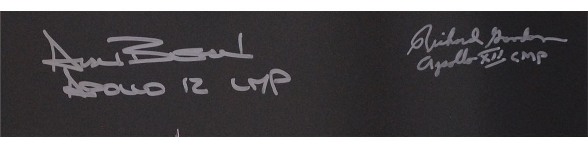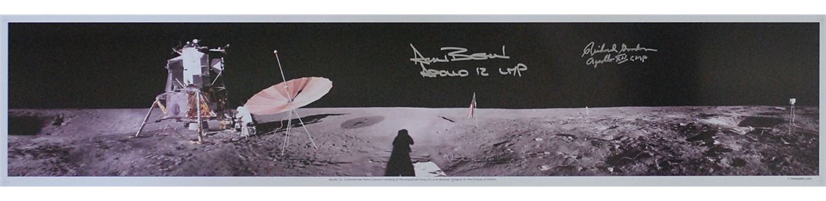 Color satin-finish 40.5 x 8.5 panoramic photo of Pete Conrad working by the Intrepid during the Apollo 12 mission, signed in silver ink, “Alan Bean, Apollo 12 LMP,” and “Richard Gordon, Apollo XII CMP.” In very fine condition. Rolled.