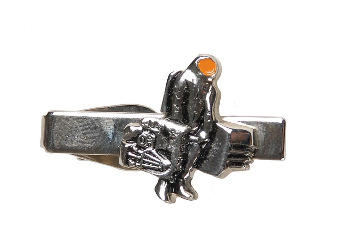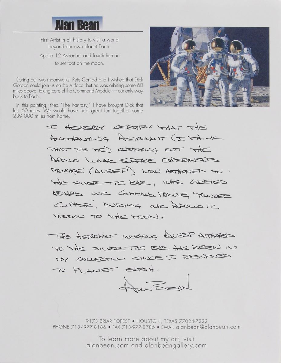 Alan Bean’s flown sterling silver tie clip carried into lunar orbit aboard the Command Module Yankee Clipper during the Apollo 12 mission, 1.25 x .75, showing an astronaut with an orange visor carrying the Apollo Lunar Surface Experiments Package (ALSEP). In fine condition. Accompanied by a lengthy handwritten and flight-certified letter of provenance from Bean, in full: “I hereby certify that the accompanying astronaut (I think that it is me) carrying out the Apollo Lunar Surface Experiments Package (ALSEP) now attached to the silver tie bar, was carried aboard our command module, ‘Yankee Clipper,’ during our Apollo 12 mission to the moon. The astronaut carrying ALSEP attached to the silver tie bar has been in my collection since I returned to planet Earth.” An uncommon flown format depicting the premiere instance an Apollo mission placed a complete nuclear-powered ALSEP station on the surface of the moon.