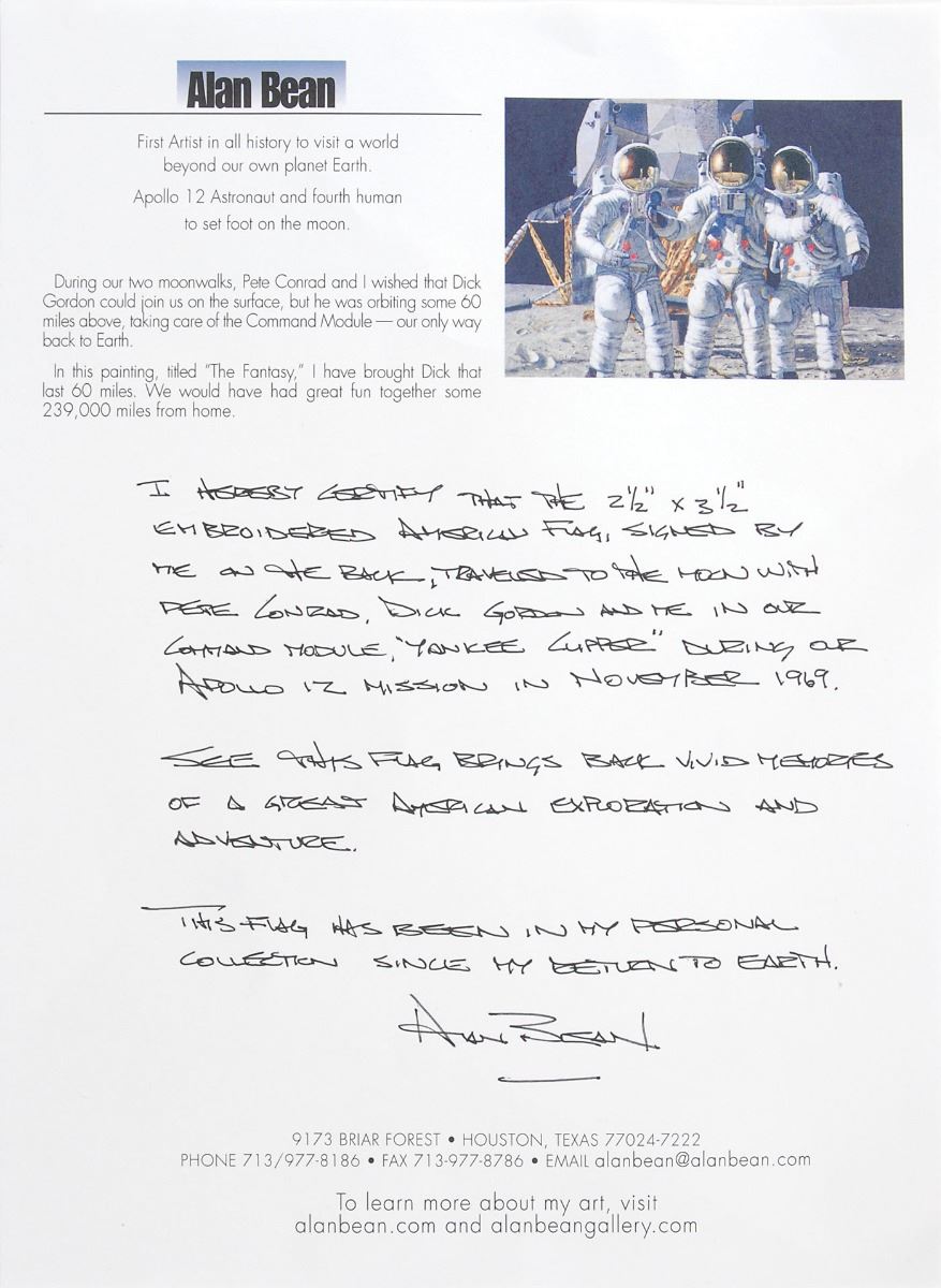 Flown embroidered American flag patch carried into lunar orbit aboard the Command Module Yankee Clipper during the Apollo 12 mission, measuring 3.5 x 2.25, signed and flight-certified on the reverse in black felt tip, “Flown to the moon, Alan Bean, Apollo 12.” In fine condition. Accompanied by a handwritten and flight-certified letter of provenance from Bean, in part: “I hereby certify that the…embroidered American flag, signed by me on the back, traveled to the moon with Pete Conrad, Dick Gordon and me in our command module, ‘Yankee Clipper’ during our Apollo 12 mission in November 1969. See this flag brings back vivid memories of a great American exploration and adventure. This patch has been in my personal collection since our return to planet Earth.” Less than three months after the historic Apollo 11 mission, the crew of Apollo 12 launched on November 14, 1969, and enjoyed a 10-day trip to and around the moon. This pristine embroidered flag remained aboard the Yankee Clipper with Richard Gordon, successfully orbiting the moon an amazing 45 times while Bean and Charles Conrad explored the Ocean of Storms.