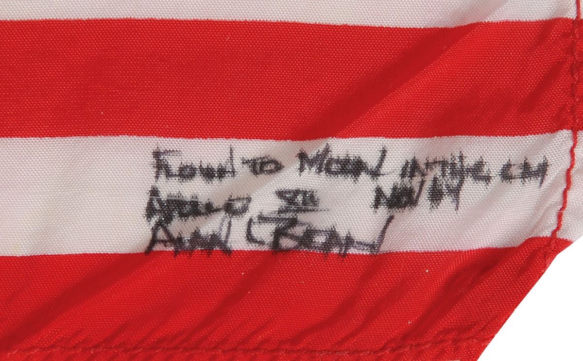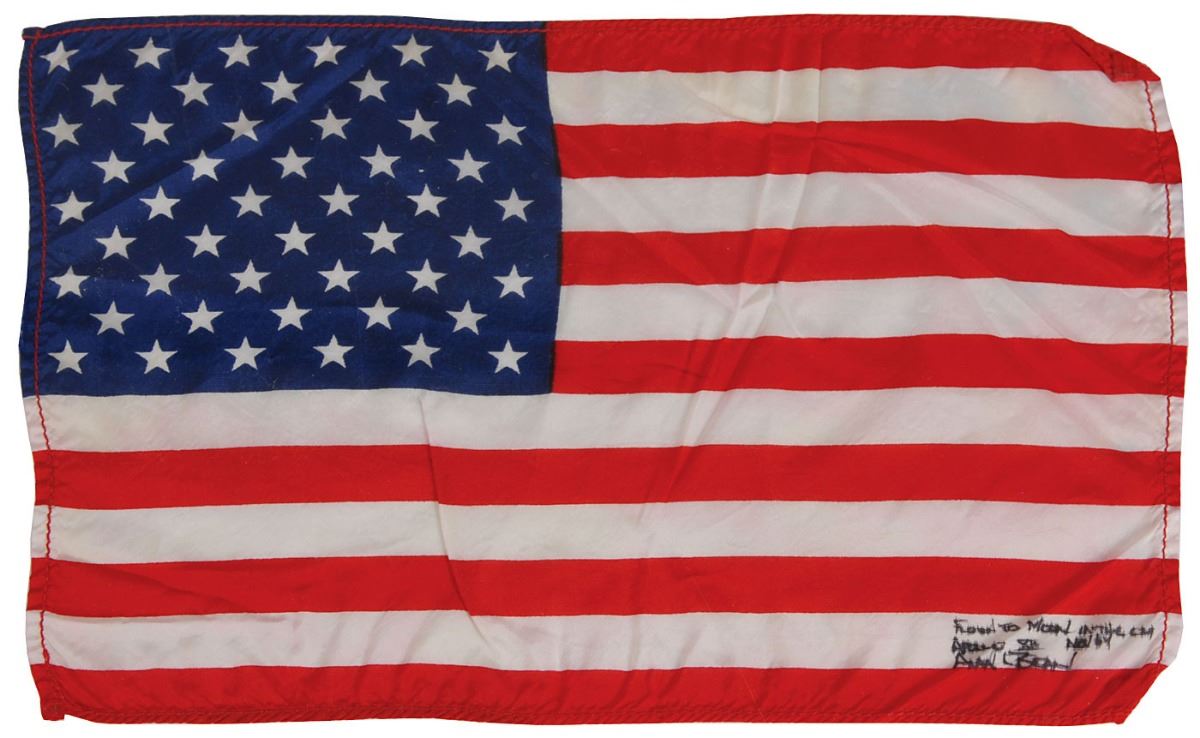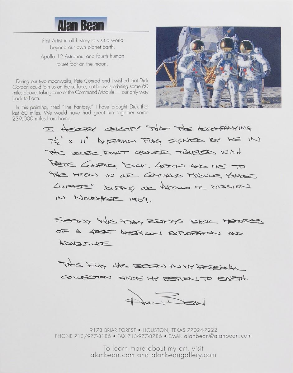 Alan Bean’s flown American flag carried into lunar orbit aboard the Command Module Yankee Clipper during the Apollo 12 mission, 11 x 7.5, signed and flight-certified in the lower right corner in black ink, “Flown to the moon in the CM, Apollo XII, Nov ‘69, Alan L. Bean.” In fine condition, with some creasing from storage. Accompanied by a handwritten and flight-certified letter of provenance from Bean, in part: “I hereby certify that the accompanying…American flag signed by me…traveled with Pete Conrad, Dick Gordon and me to the moon in our command module, ‘Yankee Clipper’ during our Apollo 12 mission in November 1969. Seeing this flag brings back memories of a great American exploration and adventure. This flag has been in my personal collection since my return to Earth.” Flown aboard the Yankee Clipper CSM over the course of a ten-day period, including a mesmerizing 45 lunar orbits, this American flag, signed and certified by history’s fourth moonwalker, is made all the more desirable by its unusually large size.