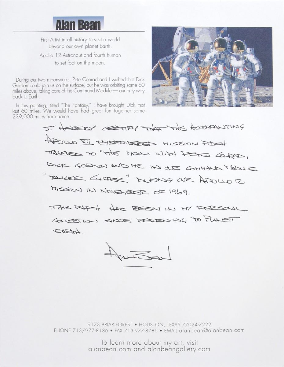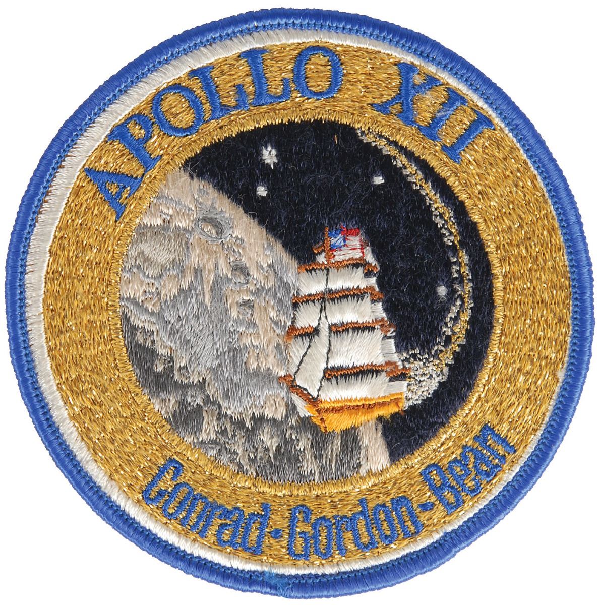 Flown embroidered Apollo 12 mission patch carried into lunar orbit aboard the Command Module Yankee Clipper, measuring 3.75? in diameter. In fine condition. Accompanied by a handwritten and flight-certified letter of provenance from LMP Alan Bean, in full: “I hereby certify that the accompanying Apollo XII embroidered mission patch traveled to the moon with Pete Conrad, Dick Gordon and me in our command module ‘Yankee Clipper’ during our Apollo 12 mission in November of 1969. This patch has been in my personal collection since returning to planet Earth.” From November 18–21, this attractive embroidered mission patch flew around the moon a total of 45 times with command module pilot Richard Gordon.
