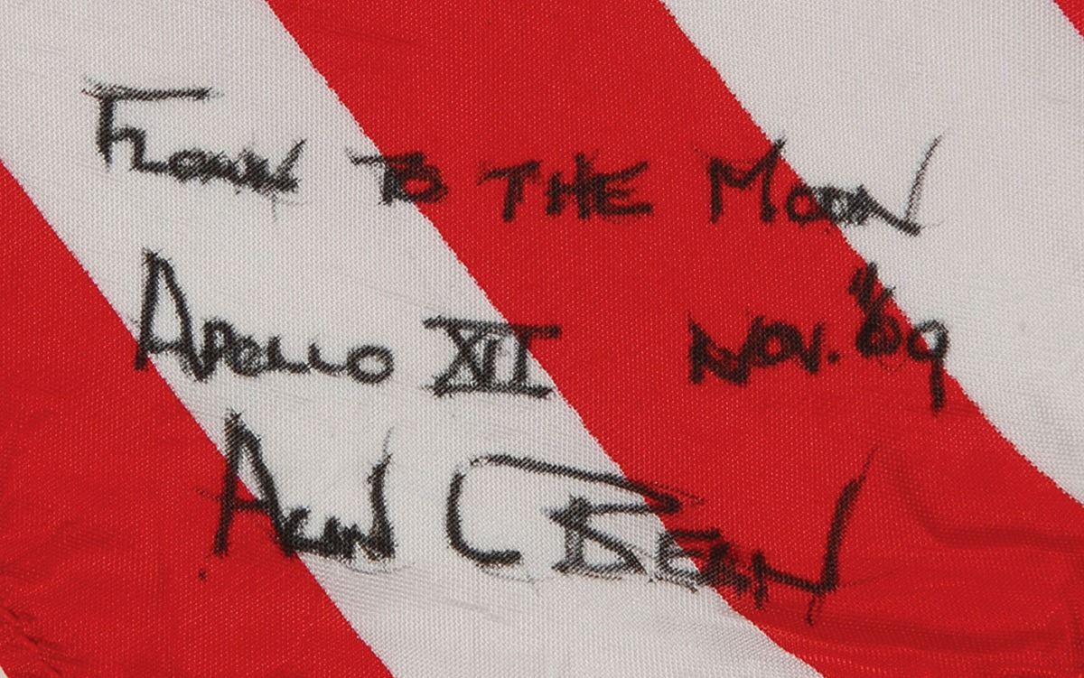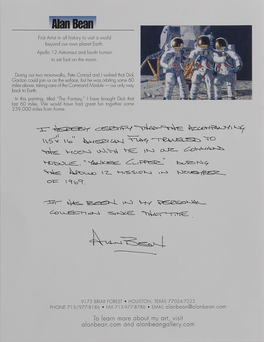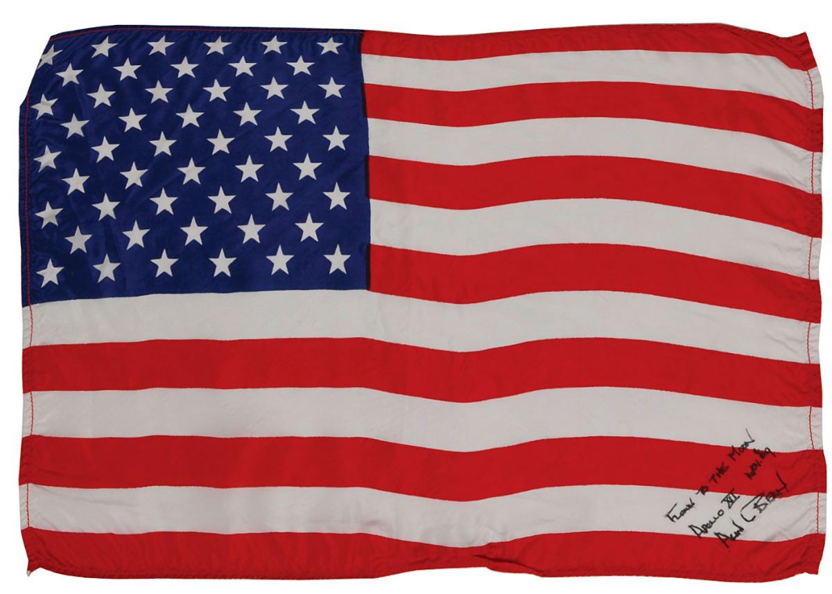 Unusually large flown American flag carried into lunar orbit aboard the Command Module Yankee Clipper during the Apollo 12 mission, 16.5 x 11.5, signed and flight-certified in the lower right corner in black ink, “Flown to the Moon, Apollo XII, Nov. ’69, Alan L. Bean.” In fine condition. Accompanied by a handwritten and flight-certified letter of provenance from Bean, in part: “I hereby certify that the accompanying…American flag traveled to the moon with me in our command module, ‘Yankee Clipper’ during the Apollo 12 mission in November of 1969. It has been in my personal collection since that time.” A fabulous oversized example of one of the most desirable flown formats, enhanced furthermore by rock solid provenance from the fourth moonwalker.