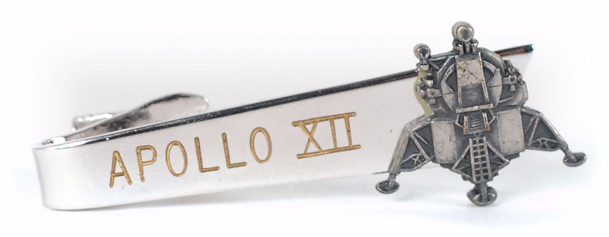 Alan Bean’s Apollo 12 tie clip flown to the lunar surface aboard the LM Intrepid, measuring 1.75 x .5, engraved “Apollo XII” with a small affixed lunar module. In fine condition. From the personal collection of Alan Bean. Accompanied by a lengthy handwritten and flight-certified letter of provenance from Bean, in full: “I hereby certify that the accompanying metal lunar module that is now attached to the tie bar engraved Apollo XII traveled to the lunar surface of the Ocean of Storms with me and Pete Conrad aboard our lunar module ‘Intrepid.’ It remained on the moon some 33 hours while Pete and I performed two moonwalks. We then lifted off to rejoin Dick Gordon in our command module, ‘Yankee Clipper,’ orbiting above. This tie bar has remained in my collection since I returned to planet Earth in November of 1969.” An attractive lunar surface-landed accessory.