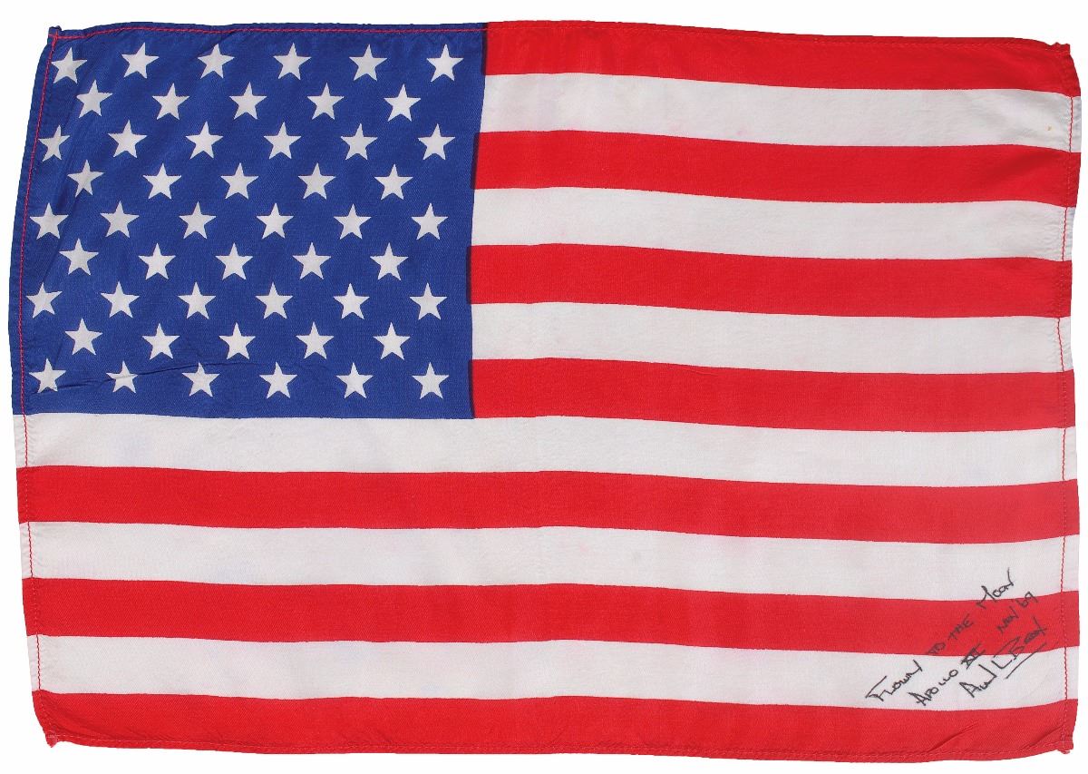 Unusually large flown American flag carried to the lunar surface aboard the lunar module Intrepid on the Apollo 12 mission, 16.5 x 11.5, signed and flight-certified in the lower right corner in black ink, “Flown to the Moon, Apollo XII, Nov. ’69, Alan L. Bean.” In fine condition. From the personal collection of Alan Bean. Accompanied by a lengthy handwritten and flight-certified letter of provenance from Bean, in part: “I hereby certify that this American flag...was landed on the Ocean of Storms with Pete Conrad and me inside our lunar module, ‘Intrepid.’ It remained within ‘Intrepid’ while Pete and I performed two moonwalks, we then launched to rejoin Dick Gordon orbiting some 60 miles above the moon in our command module, ‘Yankee Clipper’ for our return to Earth. This flag has been in my personal collection since I returned to planet Earth in November of 1969.” A fabulous oversized example of one of the most desirable flown formats.