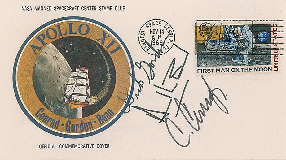 Alan Bean's Apollo 12 'Type 2' insurance cover bearing a mission emblem cachet with Manned Spacecraft Center Stamp Club wording, postmarked at the Kennedy Space Center on November 14, 1969, signed in black felt tip, "Dick Gordon," "Alan L. Bean," and "C. Conrad, Jr." Later signed and certified on the reverse by Bean, "Insurance cover from my collection, Alan Bean, Apollo 12 LMP." In fine condition.