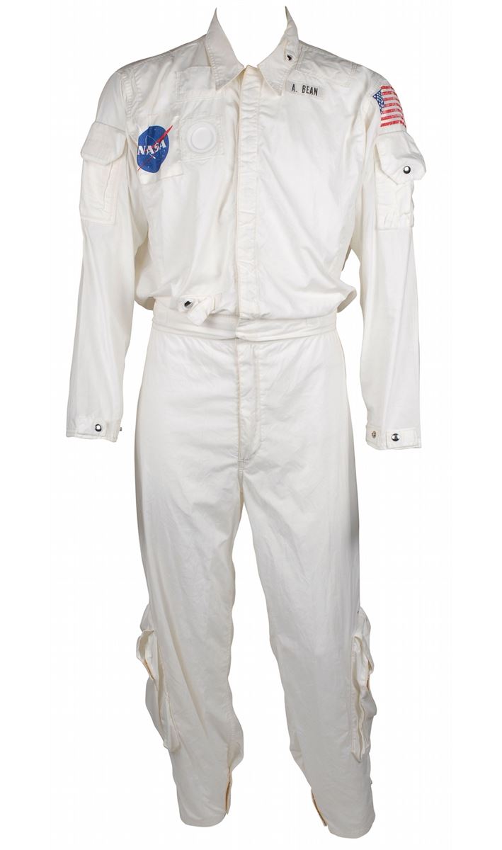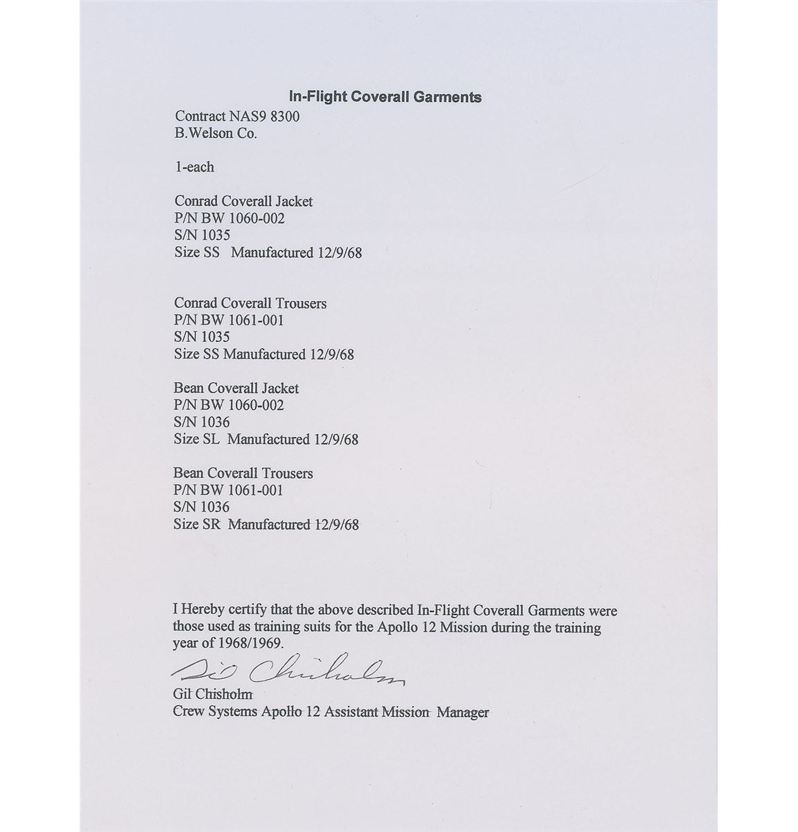 Alan Bean’s white In-Flight Coverall Garment used during training for Apollo 12, consisting of both the jacket and pants. The jacket is signed inside in black felt tip, “I wore this suit during training for my Apollo 12 mission. Alan Bean,” and bears his name patch on the left breast, “A. Bean,” an official NASA ‘meatball’ patch on the right, and an American flag patch on the left sleeve. The patch sewn inside the collar area reads: "Coverall Jacket, P/N: BW-1060-002, Size: SL S/N 1036, Subject: A. Bean, Contract No. NAS 9-8309, Date of Mfg.: 12-9-68." The pants are unsigned and bear a patch sewn inside the waistband reading: "Coverall Trousers, P/N BW-1061-001, Size: SR S/N 1036, Subject: A. Bean, Contract No.: NAS 9-8309, Date of Mfg.: 12-9-68, Mfg. by: B. Welson Co." In fine condition, with expected wear from use and some soiling to one of the side pockets of the pants. Accompanied by a signed letter of authenticity from Bean noting the part numbers, in part: "I hereby certify that I wore the following In-Flight Coverall Garment (ICG) during training for Apollo 12…The ICG was designed by NASA as an alternative to having us wear our full spacesuits inside the Apollo spacecraft all the time. We wore Class III coveralls like this one while training inside the simulators at the Manned Spacecraft Center…in Houston, Texas." Also includes a letter of authenticity from Gil Chisholm, the Crew Systems Apollo 12 Assistant Mission Manager, certifying that the garments with these part numbers were indeed used as training suits for Apollo 12. The In-Flight Coverall Garment offered far more flexibility than the bulky spacesuit, so astronauts changed into these after launch to be more comfortable during their long flight. As a training-worn Apollo ICG with excellent provenance, this is a remarkable piece of lunar mission history.