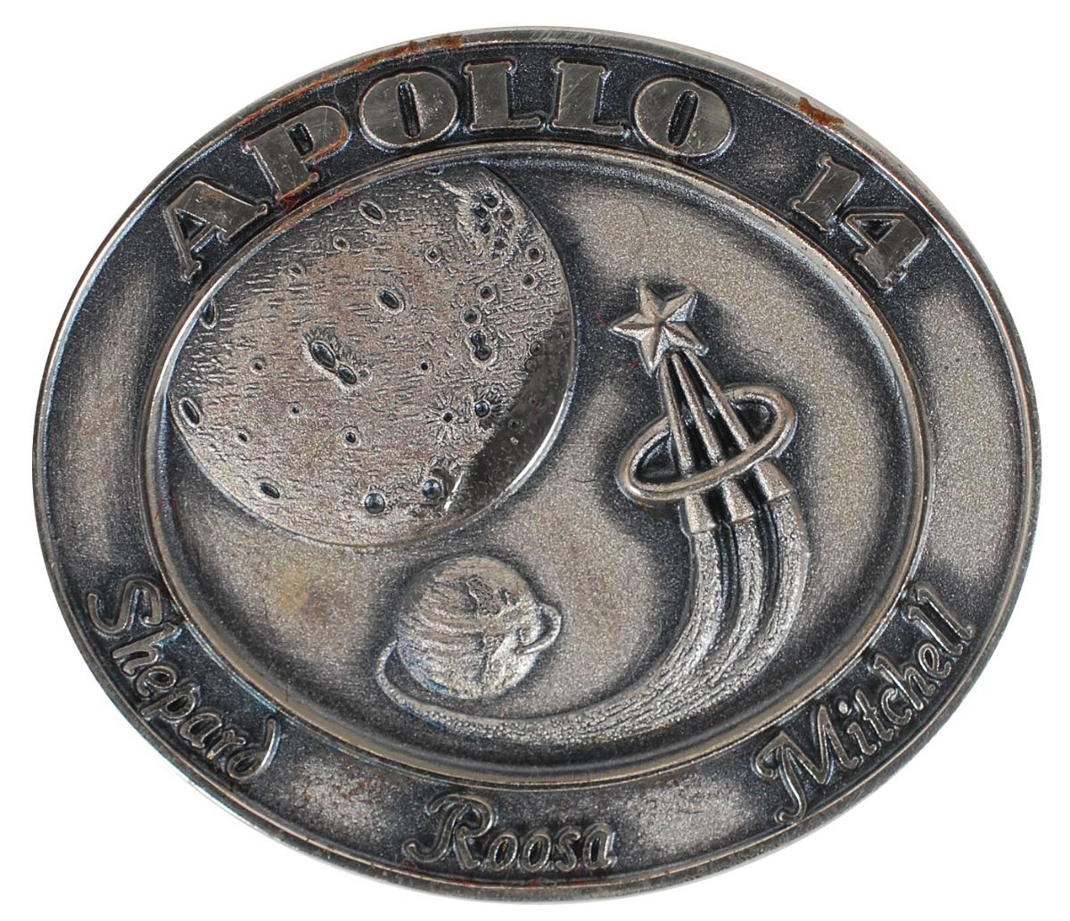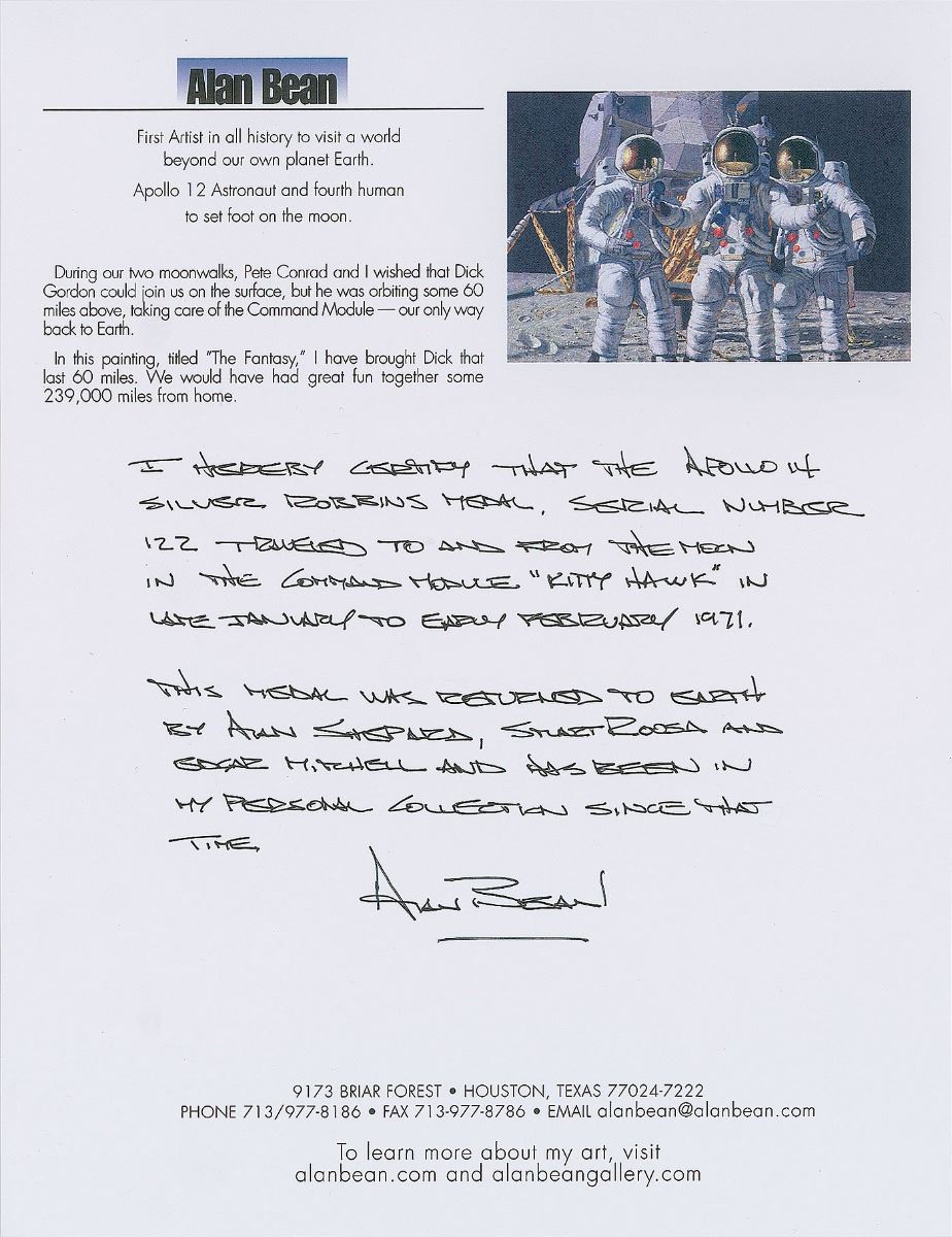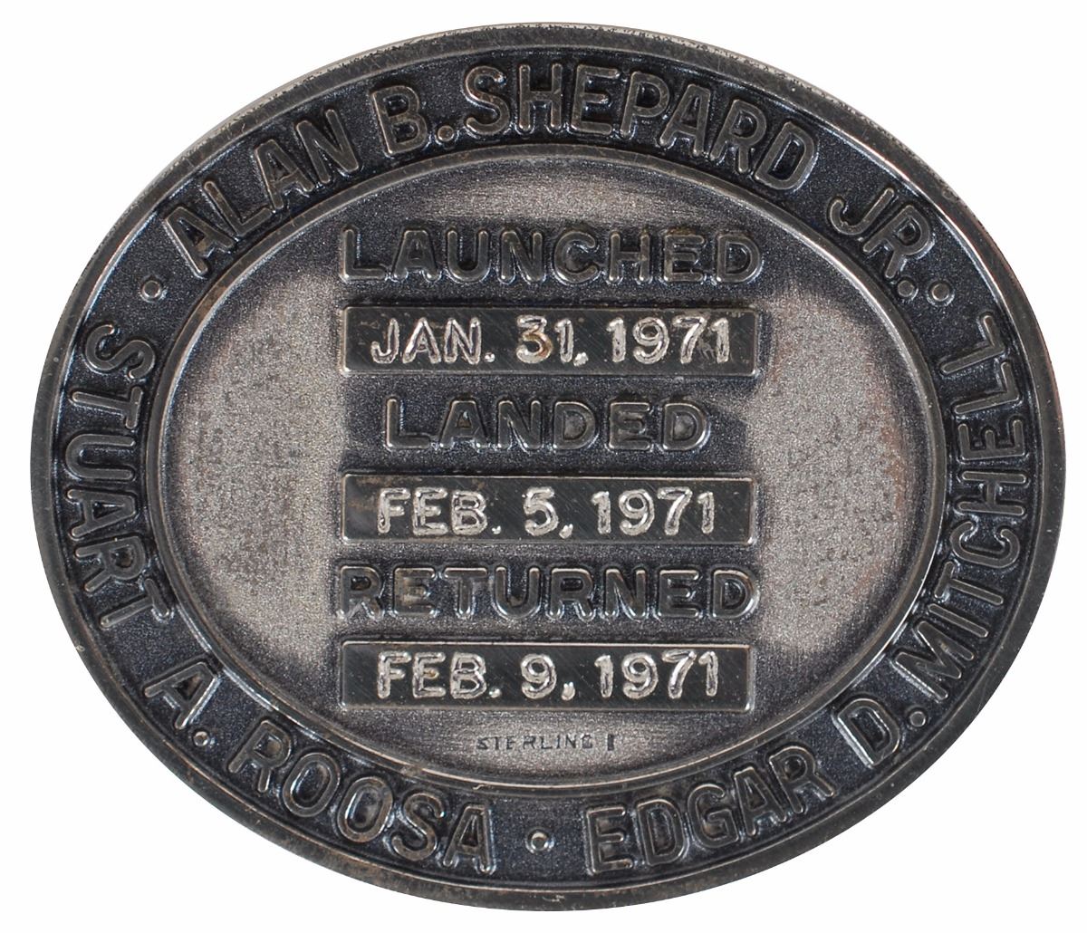 Flown sterling silver Apollo 14 Robbins medal, approximately 1.5? in diameter, with a raised design of the Apollo 14 mission insignia on the face and engraved on the reverse with the launch date of January 31, 1971, moon landing date of February 5, 1971, and return date of February 9, 1971, encircled by the astronauts’ names in raised lettering. The medal is serial numbered “122” on the rim and includes its original matching case. Condition is mint state. From the personal collection of Alan Bean. Accompanied by a lengthy handwritten and flight-certified letter of provenance from Bean, in full: “I hereby certify that the Apollo 14 silver Robbins medal, serial number 122 traveled to and from the moon in the command module ‘Kitty Hawk’ in late January to early February 1971. This medal was returned to Earth by Alan Shepard, Stuart Roosa and Edgar Mitchell and has been in my personal collection since that time.”