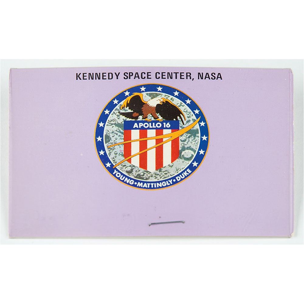 Alan Bean's official viewing badge worn for the Apollo 16 launch on April 16, 1972, no. 8408, 4 x 2.5, housed in its original plastic pocket holder. The badge features the Apollo 16 insignia against a purple background, with "Kennedy Space Center, NASA" in black lettering above. In fine condition. From the personal collection of Apollo 12 moonwalker Alan Bean, and accompanied by a letter of provenance from his daughter.