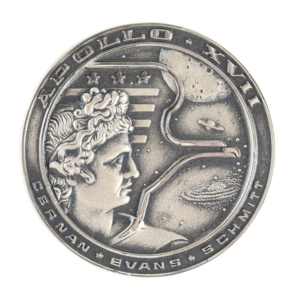 Accompanied by the original case and a handwritten letter of provenance signed by Alan Bean, in part: "I hereby certify that the Apollo 17 Silver Robbins Medal, serial number F24, traveled with Eugene Cernan, Ron Evans, and Harrison 'Jack' Schmitt aboard their Command Module 'America' during their mission to the moon in December 1972."