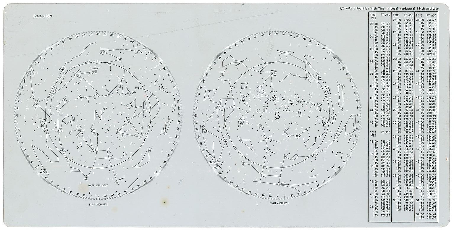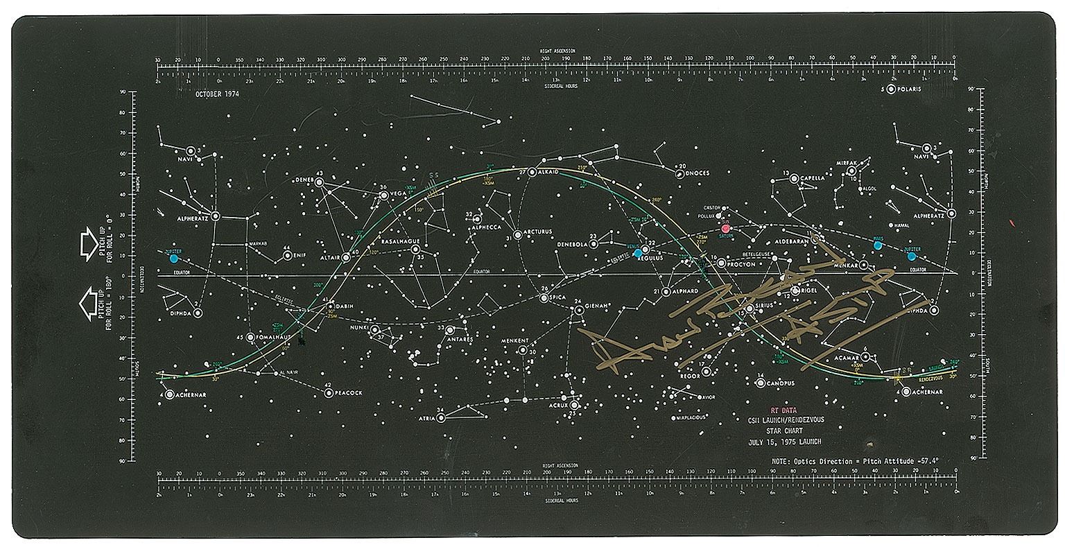 Alan Bean's training-used star chart marked "RT Data, CSM Launch/Rendezvous, Star Chart, July 15, 1975 Launch," 16 x 8, prominently signed across the front in gold ink, "Alan Bean, ASTP." The chronopaque chart traces the "Launch" path in green and "Rendezvous" path in yellow, and labels the various stars and constellations useful in celestial navigation. The reverse of the chart, marked "October 1974," has circular north and south constellation charts marked "Right Ascension," along with a table on the right side. In fine condition. This chart was used by Alan Bean while training as backup crew commander for the Apollo-Soyuz Test Project.