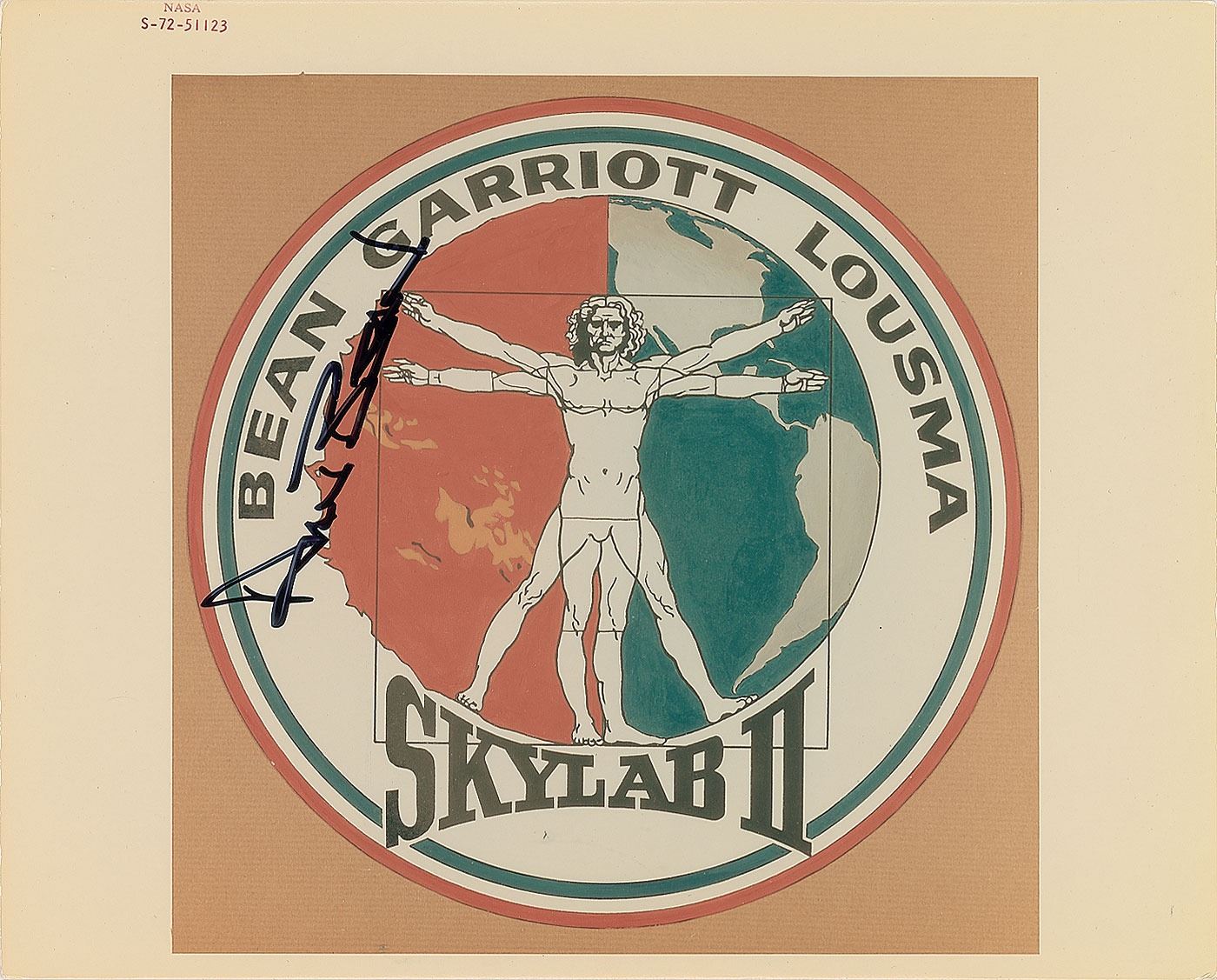 Official color glossy 10 x 8 red-numbered NASA photo of the Skylab II (SL-3) insignia, signed in black felt tip, "Alan Bean." Reverse bears “A Kodak Paper” watermarks. In fine condition. From the personal collection of Alan Bean.