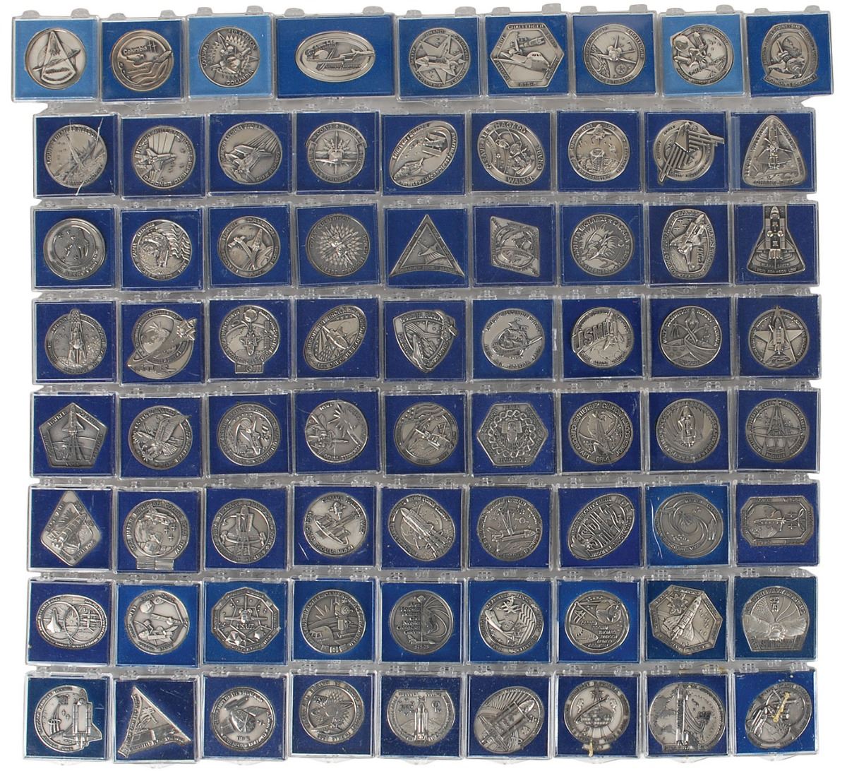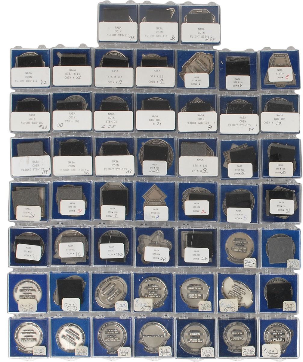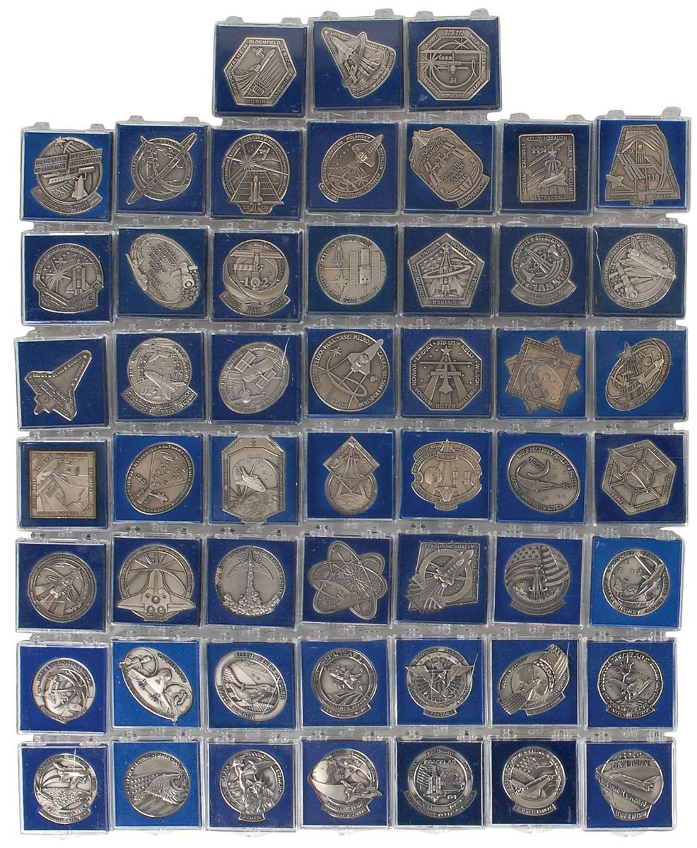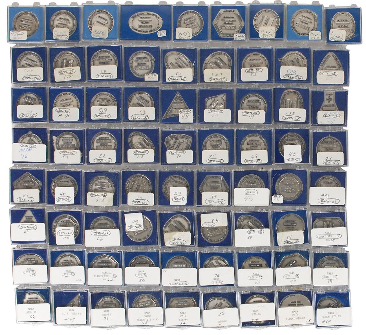 Near-complete collection of 134 sterling silver Space Shuttle Robbins medallions from the collection of Apollo astronaut Alan Bean, mostly unflown, representing every Space Shuttle mission with the exception of STS-88. The highlight of the set is a single flown Robbins medallion carried on the very first Shuttle mission, STS-1, April 12–14, 1981, serial #45F. The remainder are unflown, and the set includes the sought-after restruck medallions for the tragic STS-51L and STS-107 missions. Among the other highlights are: the early missions such as STS-2, STS-3, STS-4, STS-5, and STS-6; the rarest Shuttle Robbins medal, STS-111, with only 94 produced; and notable missions such as STS-71, the first docking of a shuttle to a space station. The medals typically measure about 1.5? in diameter and feature raised mission insignia designs on the face with the launch and return dates engraved on the reverse. Serial numbers are engraved on the edges up to STS-120; after that, the Astronaut Office no longer engraved serial numbers on the medallions, and the numbers are only shown on labels affixed to each case; many of these labels are also annotated with the mission name in Bean’s own hand. All are in their original cases; a few cases are cracked. Condition is generally mint state. Accompanied by a lengthy handwritten letter of provenance from Bean. A complete list of the 134 Robbins medallions and their corresponding serial numbers is available online at RRAuction.com. A stunning collection of Robbins medallions rarely offered in such great quantity and enhanced by its superior provenance.