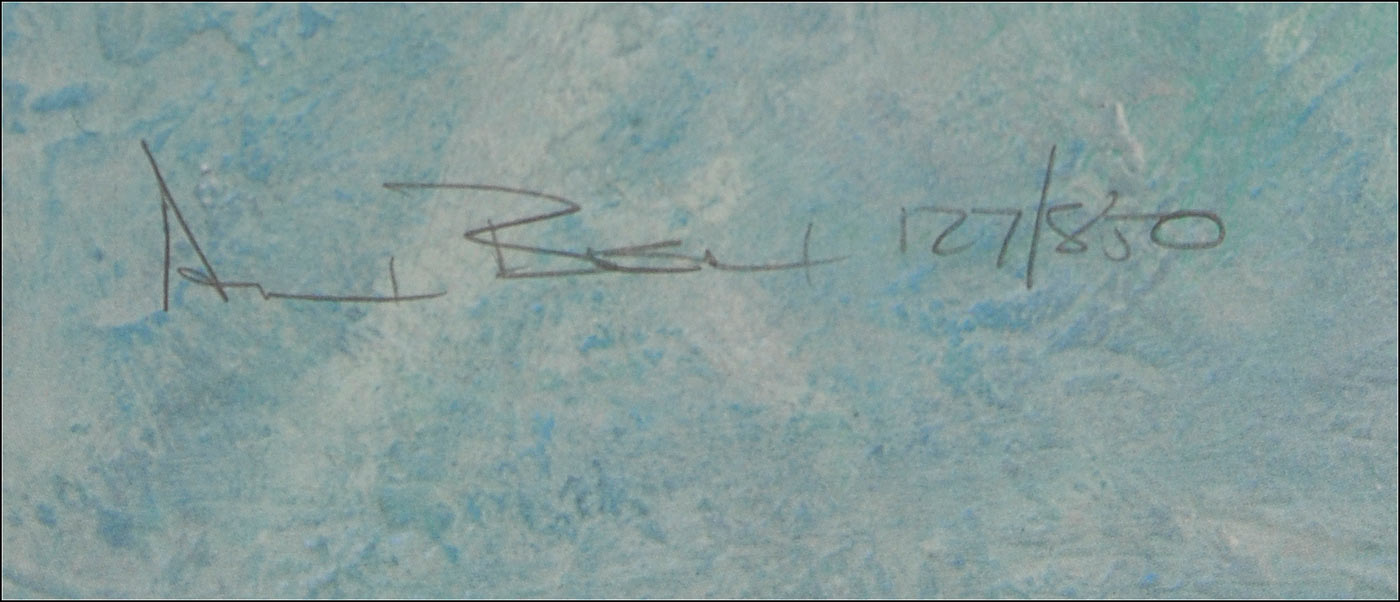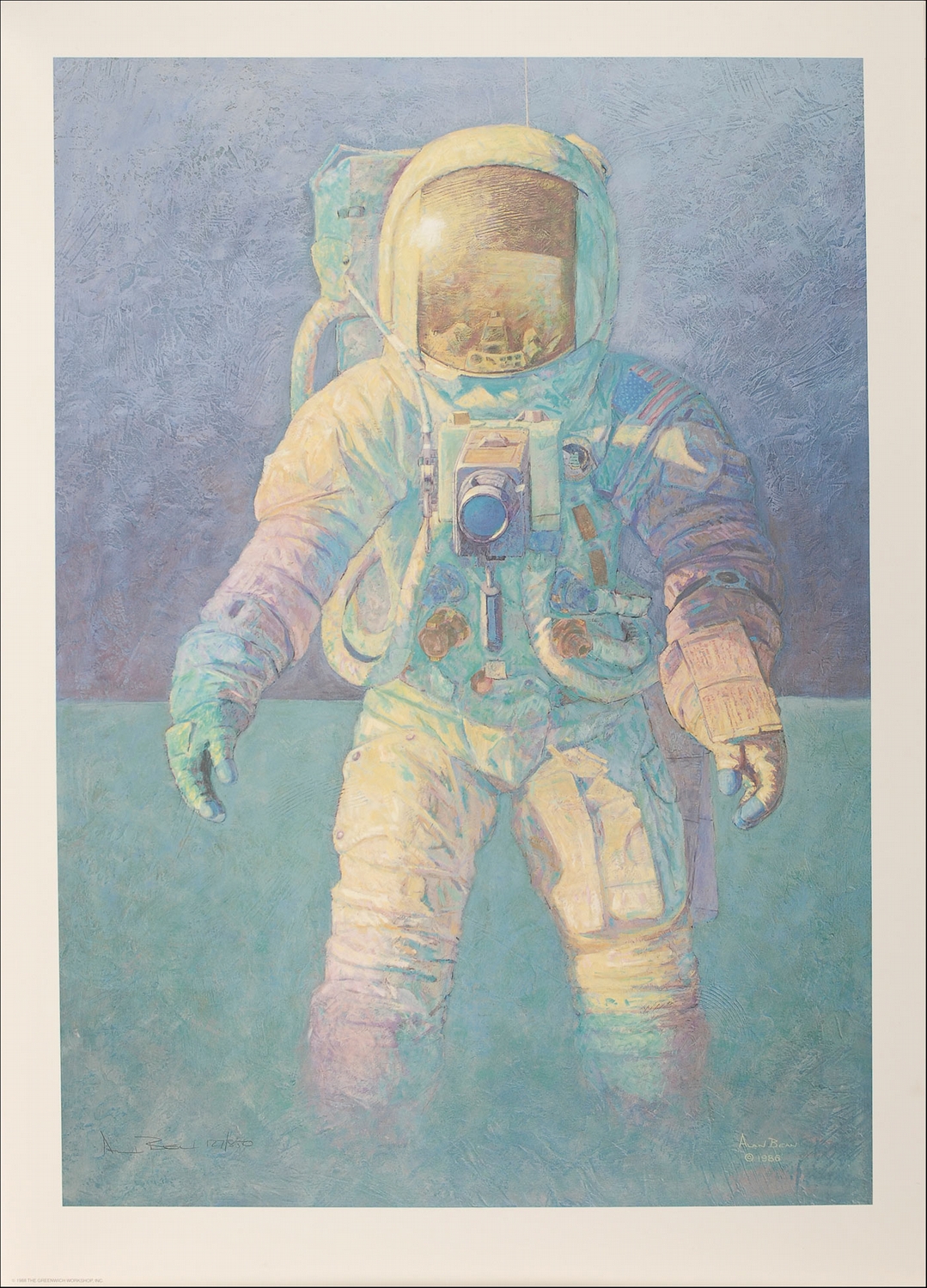 Color limited edition 19 x 27 lithograph entitled ‘That’s How It Felt to Walk on the Moon,’ numbered #127/850, signed in pencil by Bean. In fine condition. Accompanied by its Greenwich Workshop portfolio. This particular work by Bean sold out years ago and is one of his most desired single-signed works.