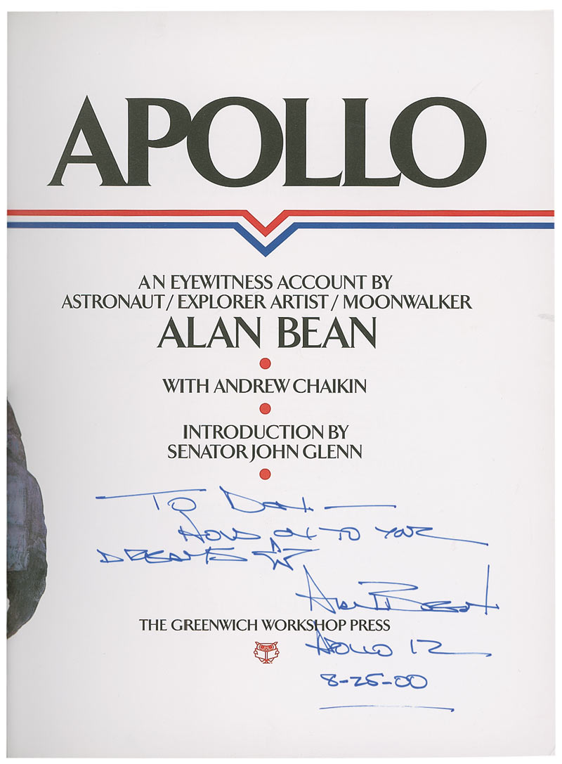 Signed book: Apollo. Later printing. Connecticut: Greenwich Workshop Press, 1998. Hardcover with dustjacket, 9.5 x 12.5, 176 pages. Signed and inscribed on the title page in blue felt tip, “To Dot—Hold on to your dreams. Alan Bean, Apollo 12, 8–25–00,” adding a sketch of a star. In fine condition.