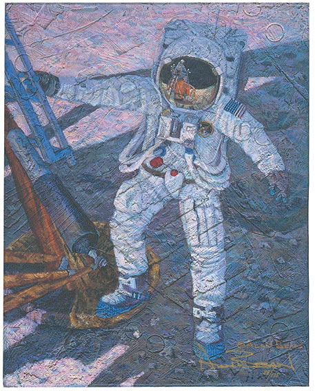 Color limited edition 12 x 15 giclee print on canvas stretched over a wooden frame, entitled ‘A Giant Leap,’ numbered #28/175. Signed in gold ink by Alan Bean. In very fine condition.