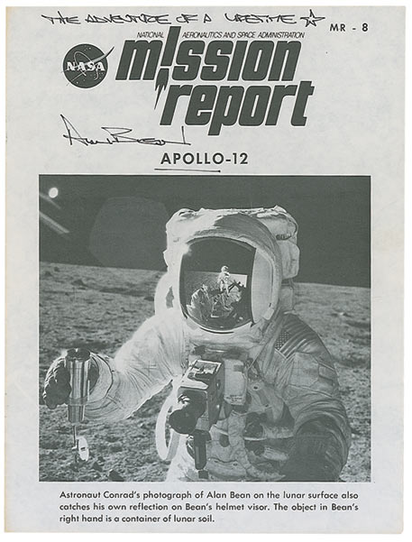 NASA ‘Mission Report’ publication for Apollo 12, 16 pages, 8 x 10.5, signed in black felt tip on the cover “The Adventure of a Lifetime, Alan Bean,” adding a sketch of a star following his sentiment. In fine condition.
