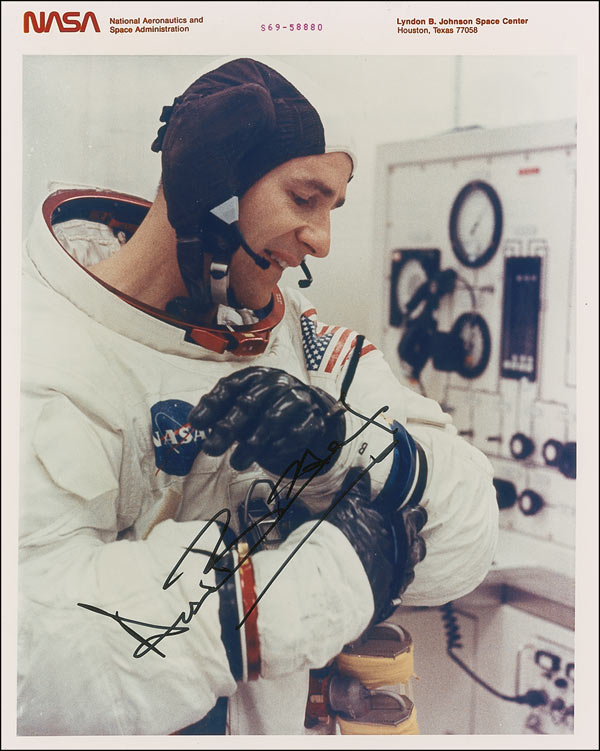 Color satin-finish 8 x 10 NASA photo of Bean adjusting his cuff on his spacesuit as he prepares for the Apollo 12 launch, signed in black felt tip. In fine condition.