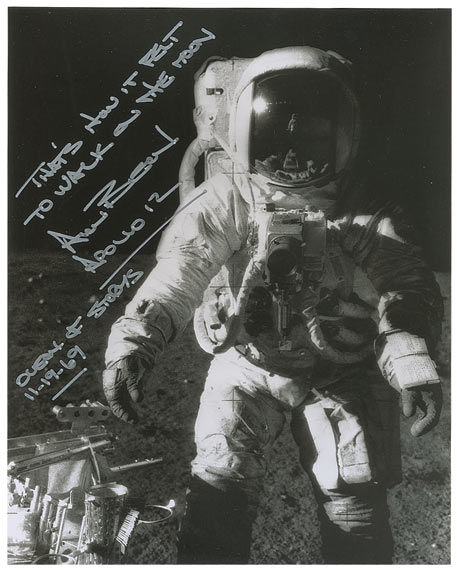 Color satin-finish 8 x 10 photo of Bean bathed in light on the lunar surface, signed in silver ink, “That’s how it felt to walk on the moon. Alan Bean, Apollo 12, Ocean of Storms 11-19-69.” In very fine condition.
