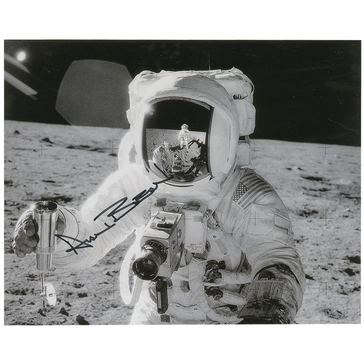Satin-finish 10 x 8 photo of Bean on the lunar surface with a camera, signed in black felt tip, “Alan Bean.” In very fine condition.